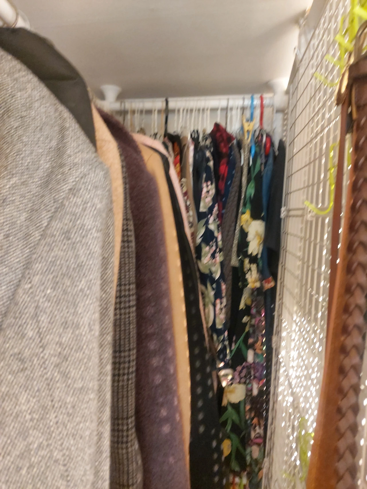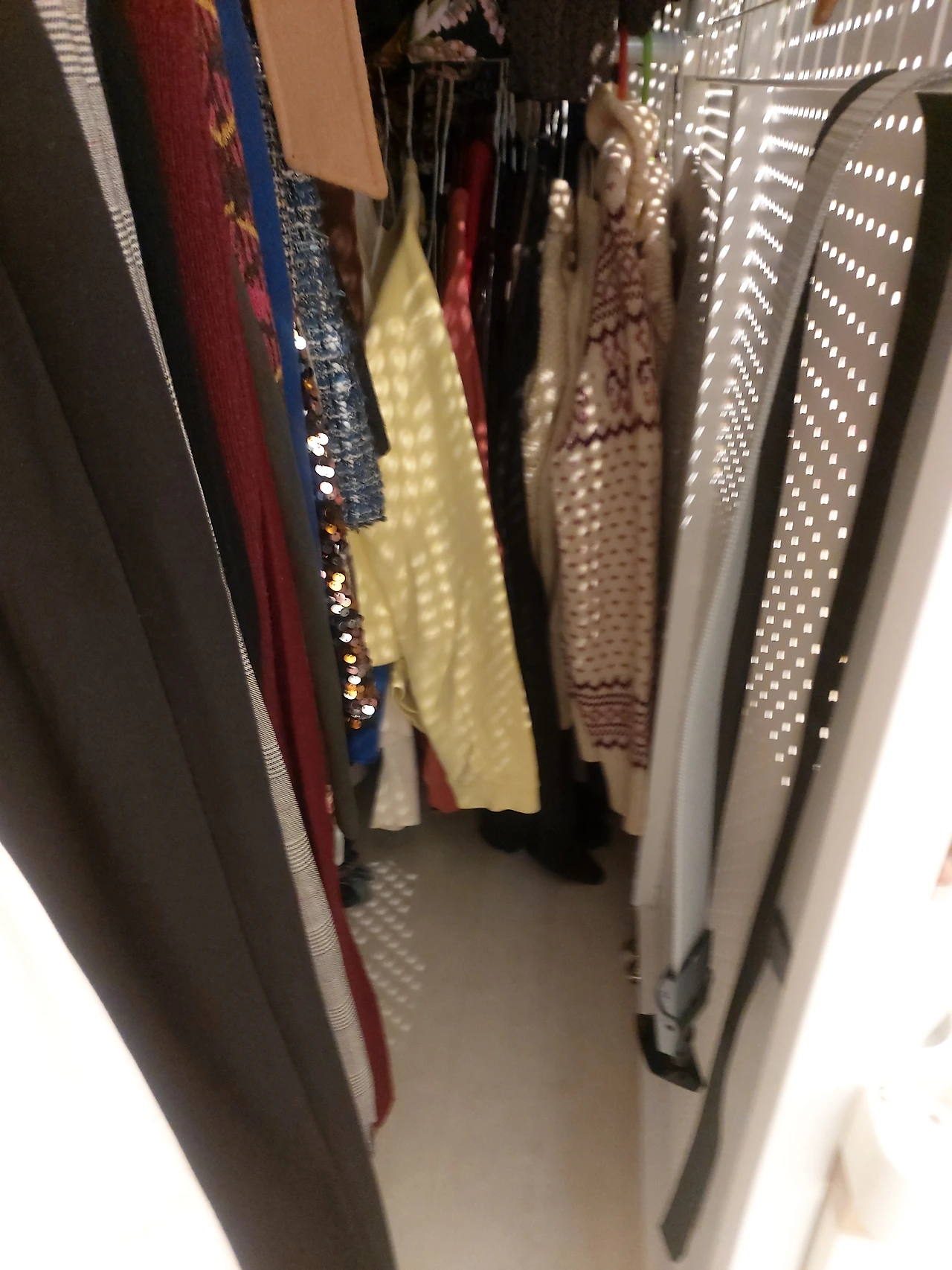 다섯 벌을 꺼냈더니 내부 공간이 보이기 시작했다. 들어가서 옷을 꺼낼 수는 있게 되었다. 그래도 아직은 미니드레스룸이라고 부를 수 있을 정도로 여유롭게 옷을 둘러볼 수 있는 건 아니었다. 좀 더 정리가 필요했다. 이렇게 적으면서도 웃기지만 좀 더 정리가 필요하다는 걸 인정하는 게 여전히 너무나 어렵다.