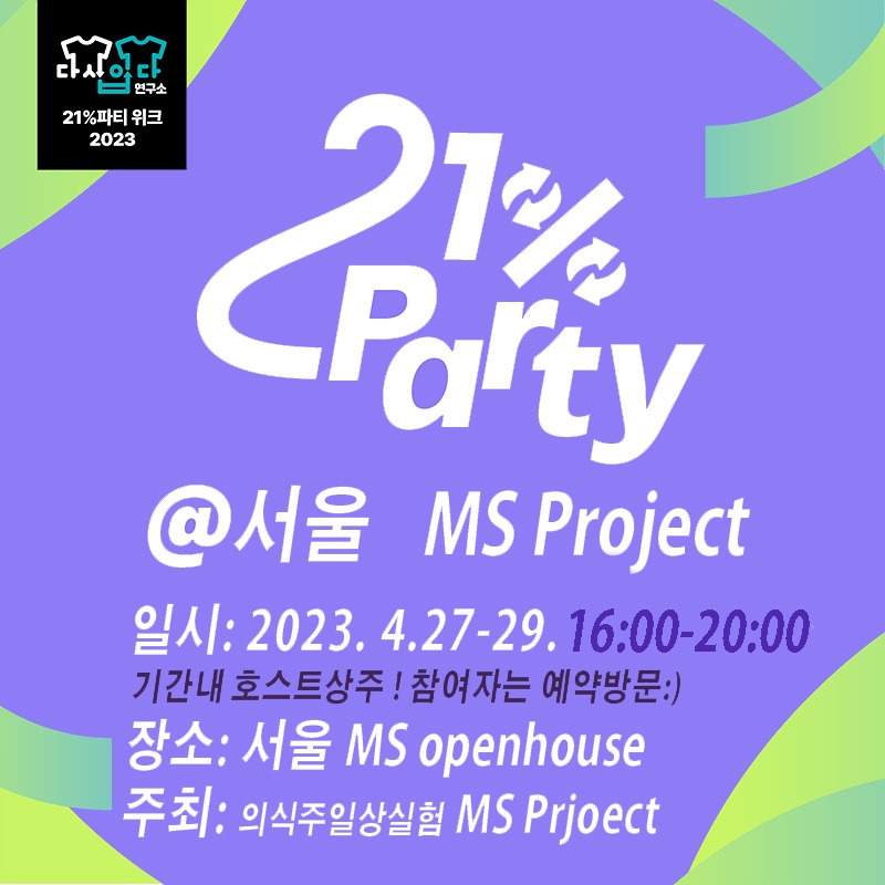 2020년, 다시입다연구소 설립과 함께 진행한 설문조사 결과, 옷장에 있는 옷 중 사놓고 입지 않는 옷의 평균 비율이 21%로 나타났습니다. 바로 이 21%의 입지 않는 옷들이 21% 파티의 주인공입니다.