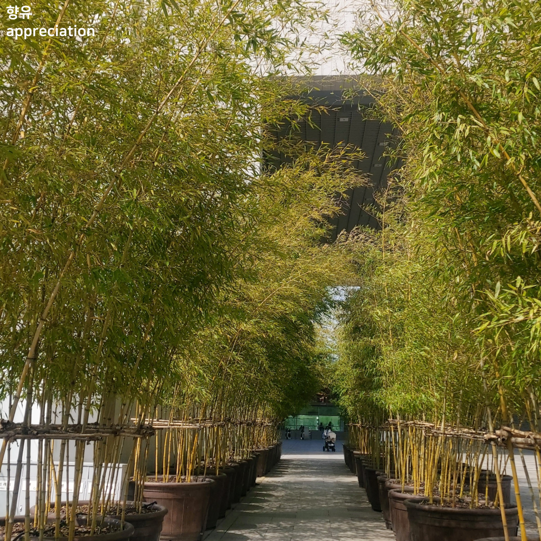 대나무가 양옆으로 늘어선 진입로를 사랑한다. 이촌역 지하에서 올라와 탁 트인 정원을 지나 널따란 계단 왼쪽으로 가지런히 늘어선 대나무들. 사람만큼 큰 화분에 심은 대나무들이 건물 몇 층에 이르는 높이로 무성한 녹음을 이룬다. 그 길에 걷다 보면 저절로 전시를 볼 마음의 준비를 하게 한다. 바람에 흔들리는 높다란 대나무가지 끝으로 시선을 이끌고 펼쳐진 하늘과 국립중앙박물관의 압도적인 건축과 마주한다. 전시실 안에 기다리고 있는 수많은 유물들 그리고 그것에 얽힌 이야기들을 떠올리며 어디에서부터 시작할까 고민하다 보면 어느새 대나무 터널이 끝난다.