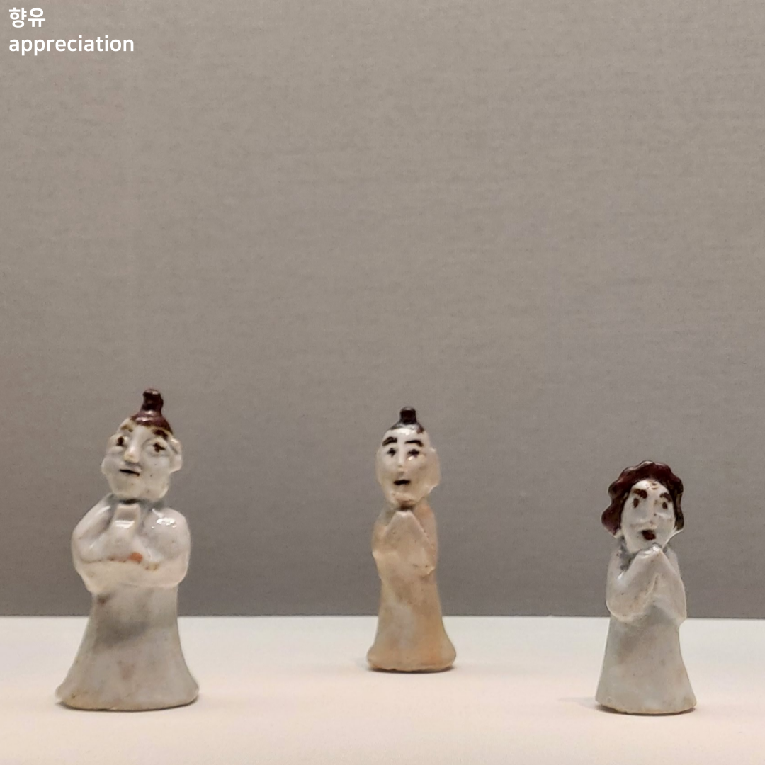 그러다 보면 이따금 아주 작은 것들이 마음을 사로잡는다. 죽은 이의 내세를 위해 만든 어른 손가락 크기보다도 작은 인물상들도 그랬다. 손으로 대충 빚은 비대칭에 무심하게 툭툭 손톱으로 눌러가며 만들어낸 얼굴에도 다채로운 표정과 가지런히 손을 모은 자세가 생생했다. 누군가를 바라보며 기다리고 있는 한편으로 침착한, 걱정스러운, 놀란 감정까지도 드러나는 표현력. 이 인물상들이 지키고 바라보고 있는 그 누군가가 세상을 떠날 때 그를 보내는 사람들도 마찬가지였으리라 유리진열장 앞에 주저앉아 한참을 생각에 잠겼다.
