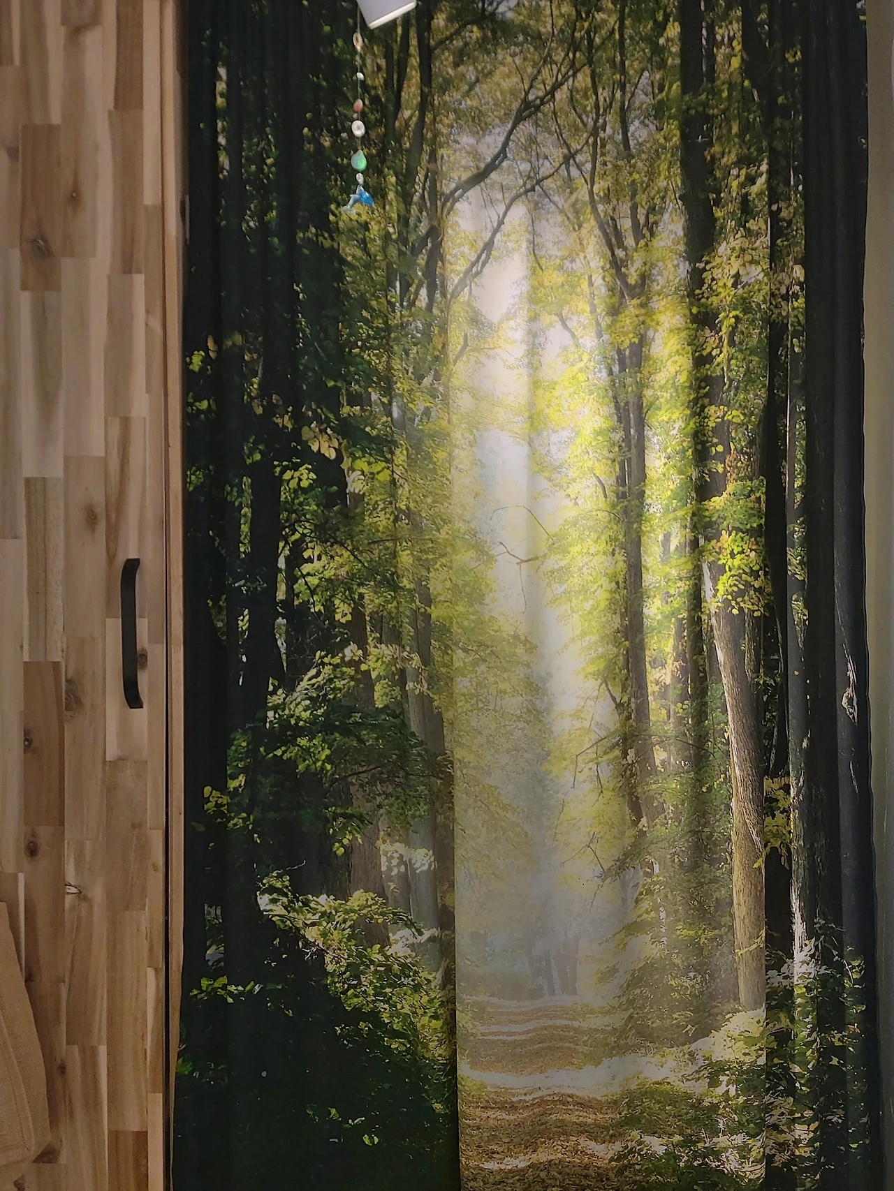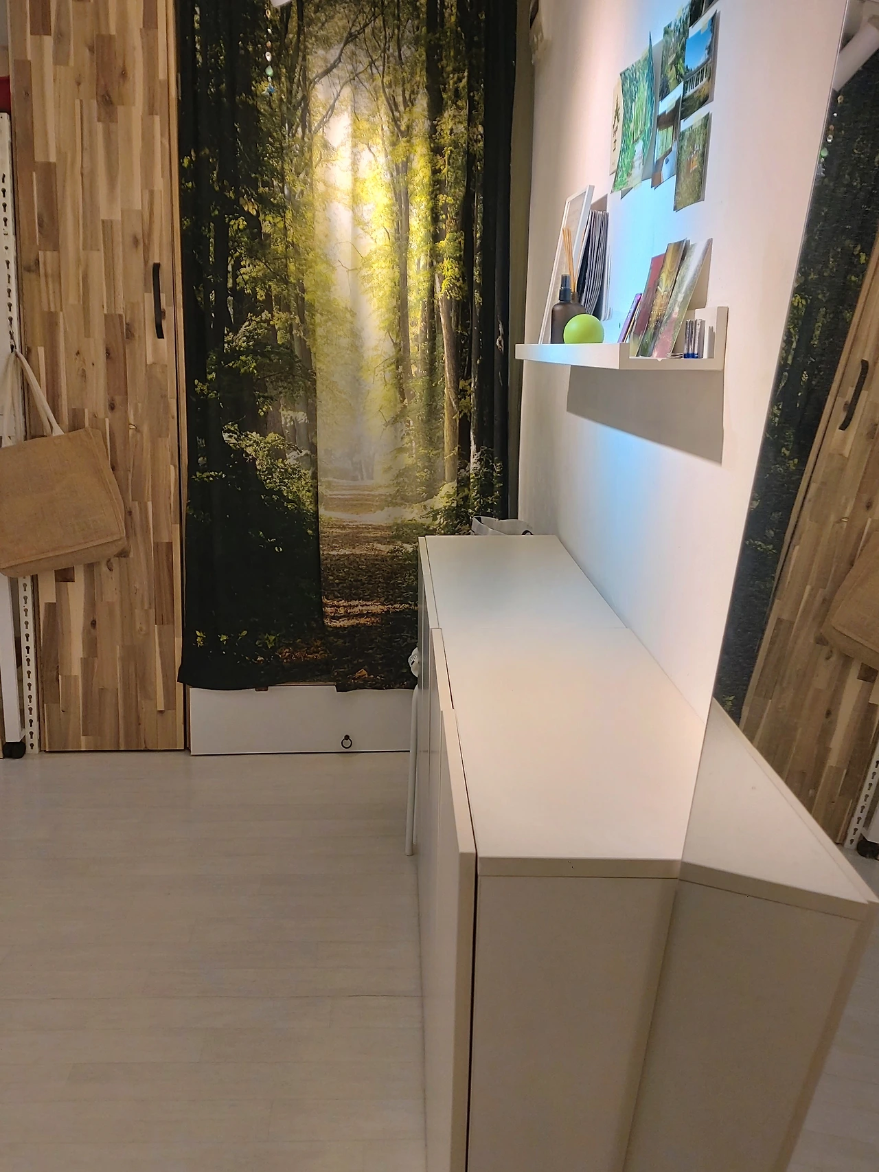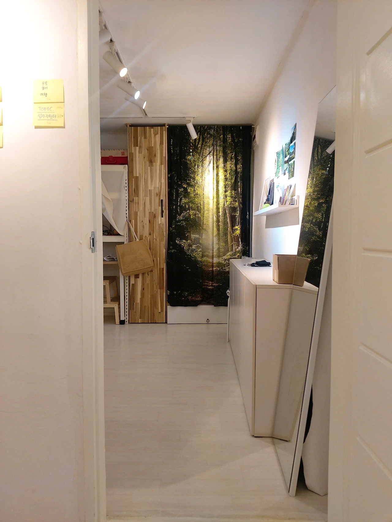 이미 레일조명으로 조명의 효과를 충분히 활용하고 있다고 생각했던 나는, 다시금 각 공간의 역할을 생각하며 조명의 위치를 검토하고 재조정했다. 현관에 어둠을 감지하고 켜지는 조명을 달아 막 돌아왔을 때, 혹은 불을 다 끄고 나설 때에도 편안히 활동을 할 수 있도록 그리고 옷장에도 역시 하나 더 달아서 옷을 확실히 확인하고 꺼내어 입거나 다시 걸어둘 수 있도록. 현관에 들어섰을 때 시선이 닿는 벽면에 붙여둔 그림에 조명을 드리우고 책상에 앉았을 때 편안히 작업할 수 있도록, 책상에서 시선이 닿는 곳에도 조명을 달아 커튼의 숲풍경에 햇살이 드리워지는 모습에 빛을 더했다. 침대에도 이미 쓰고 있던 스폿조명의 방향을 잡아주는 것으로 끝. 펜던트나 스마트조명을 장바구니에 넣어두었지만 지금 쓰고 있는 조명들이 수명을 다하기 전까지는 굳이 바꿀 필요가 없다는 걸 깨달았기에 미련 없이 포기했다.
