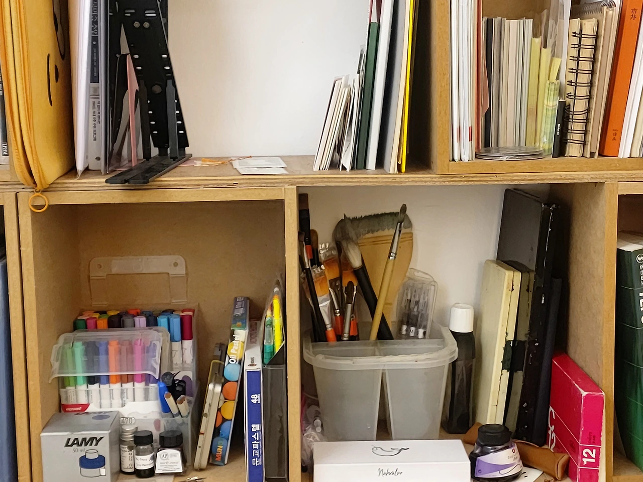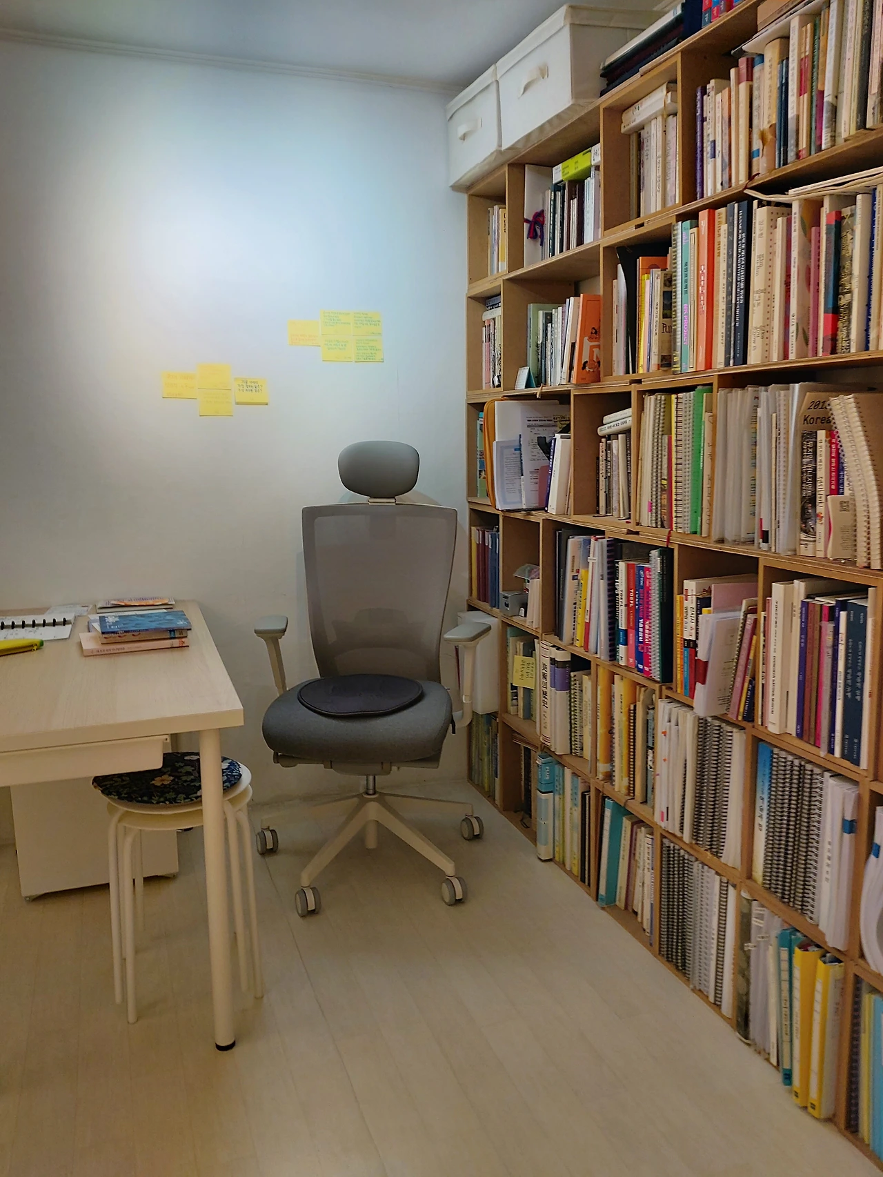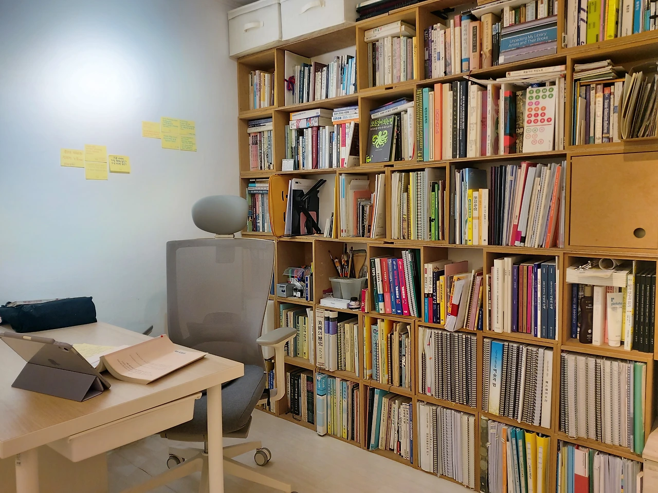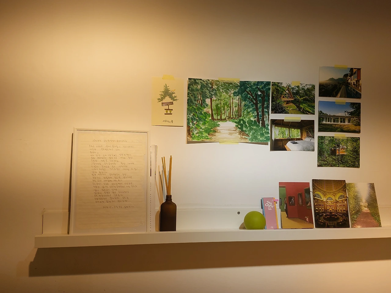 그렇게 바꾸어나가면서 이제 걸핏하면 바꾸곤 했던 책상의 위치는 두 달째 그대로 편안하게 사용하고 있다. 부엌 식탁의 불편함이나 거실에 대한 불만을 바꾸지는 못했지만 집에 들어왔을 때 내가 그린 작품과 좋아하는 이미지들이 아로마향과 함께 나를 맞이한다. 책상에 앉아서 책을 들춰보기도 하고 만년필과 엽서를 꺼내 편지를 쓰기도 하고 화집이나 서류들을 다시 훑어보며 보내는 시간이 늘었다. 이따금 고개를 들어 숲풍경 너머를 상상하고 창밖의 하늘을 쳐다볼 수 있어서 답답하지 않다. 그리고 여전히, 내 공간은 내 시간과 함께 변화하는 중이다. 욕구가 변화하면서 공간도 변화가 필요하다는 말 덕분에 완벽한 정리정돈이란 없다는 것을 더욱 분명히 깨닫고 나니 이제는 공간을 정리 정돈하는 데에 부족함도 조급함도 없다.