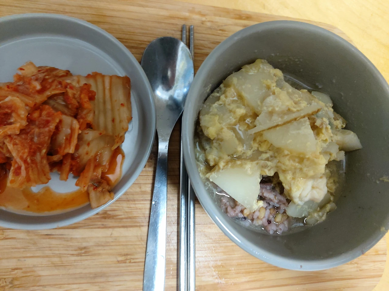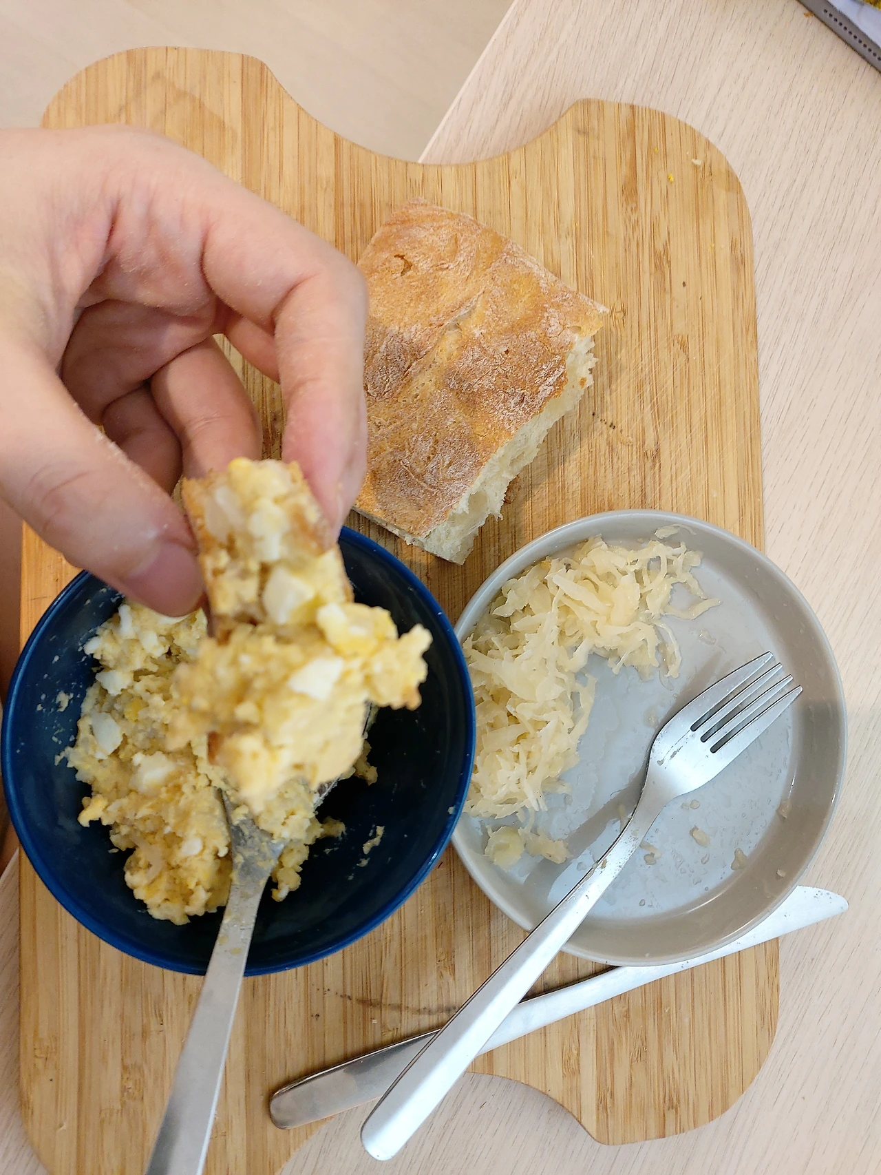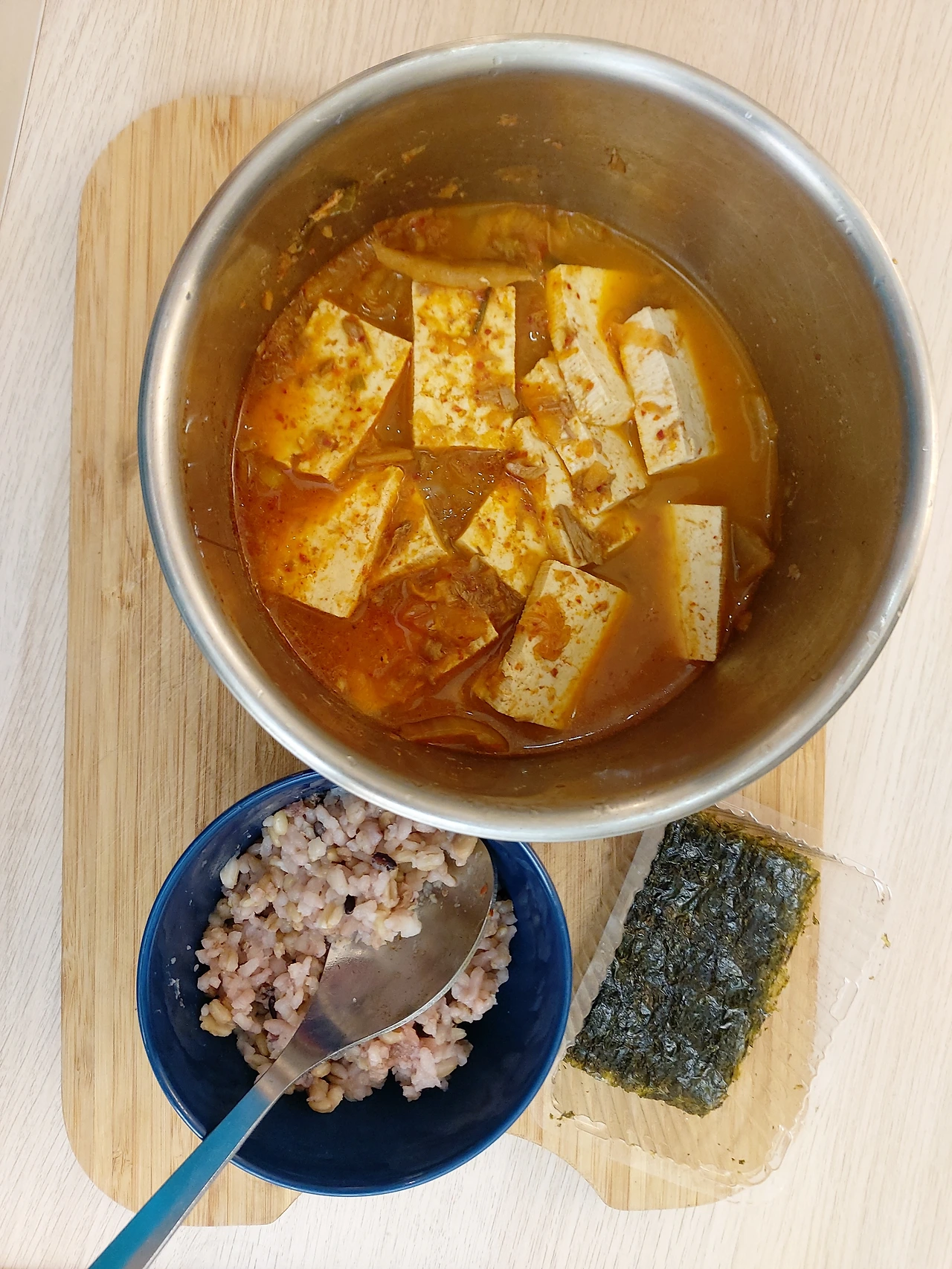뢰스티, 납작 감자(smashed potato), 감자샐러드, 감잣국. 매번 감탄을 하며 음미하고 내가 만들었지만 너무 맛있다며 자화자찬을 거듭하고 한 번 더 만들어먹다 보니 감자는 어느새 동나 있었다. 자연스럽게 감잣국을 만드느라 산 계란 한 판도 이어서 다양하게 만들기 시작했다. 계란장, 계란샐러드, 계란국으로 계란도 다 먹고 나자 이제는 다른 오래된 냉장고 속 재료들도 활용해 볼 자신이 생겼다. 버릴까 고민하고 있었던 묵은지를 검색 끝에 김치찌개로도, 김치전으로도, 심지어 장아찌로도 활용할 수 있다는 걸 알고서는 그중 제일 좋아하는 김치찌개를 만들기로 했다. 참치와 함께 김치찌개로 만들고 나서는 그 맛에 감탄하며 또 한 번 두부를 사 와서 더 얼큰한 김치찌개를 만들었다.