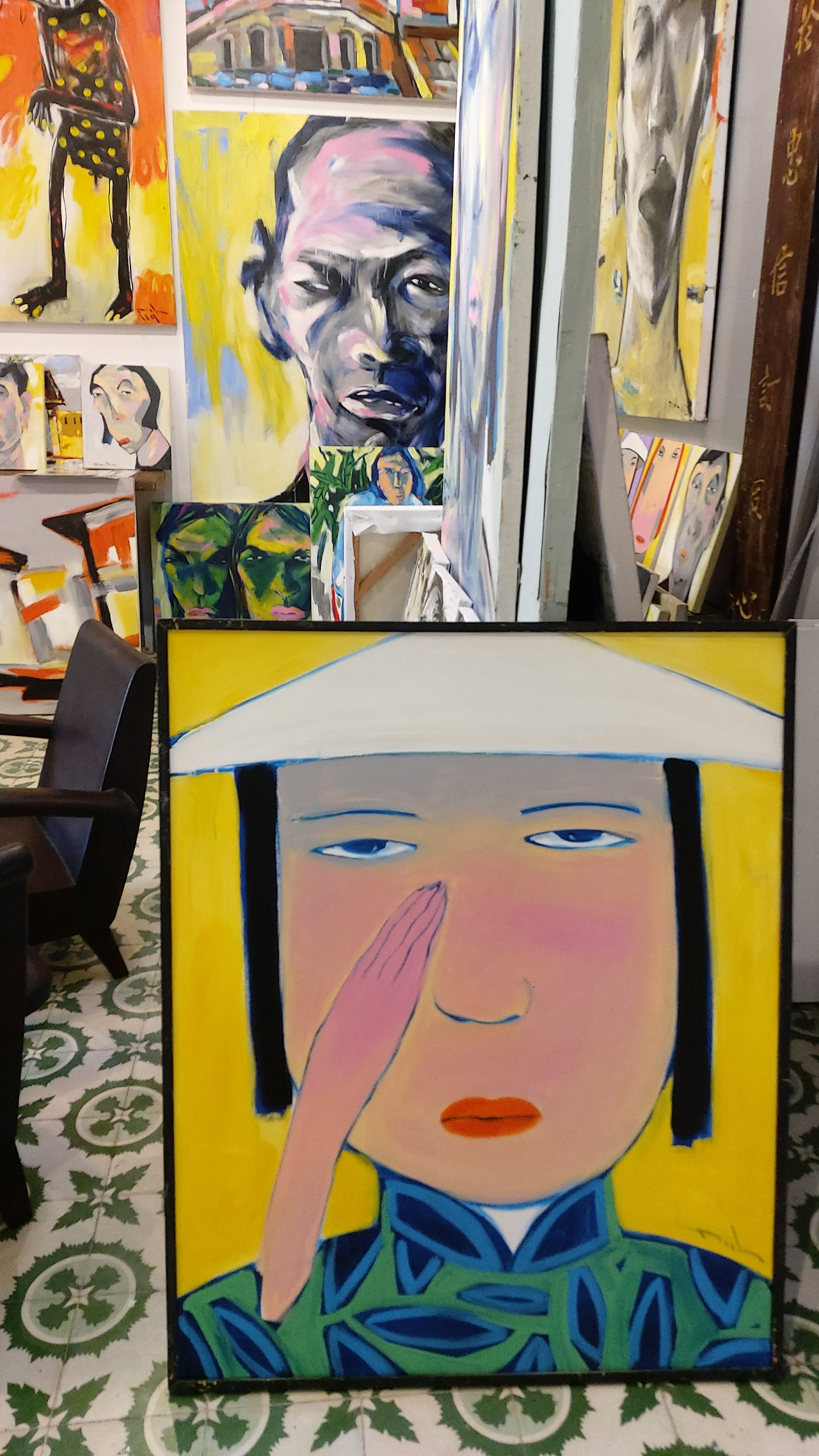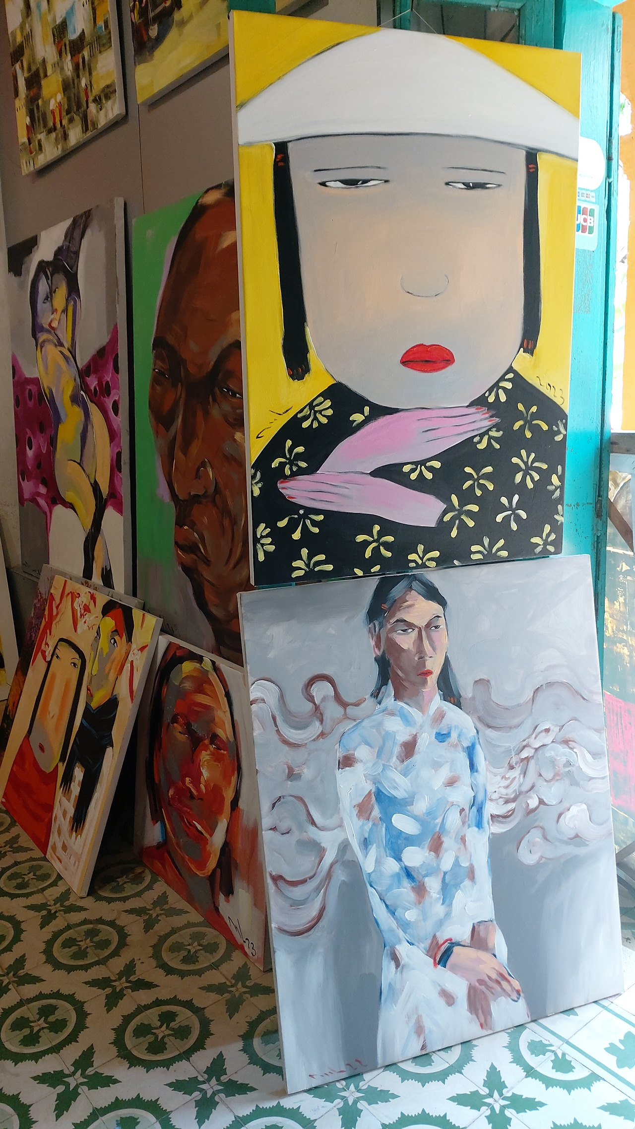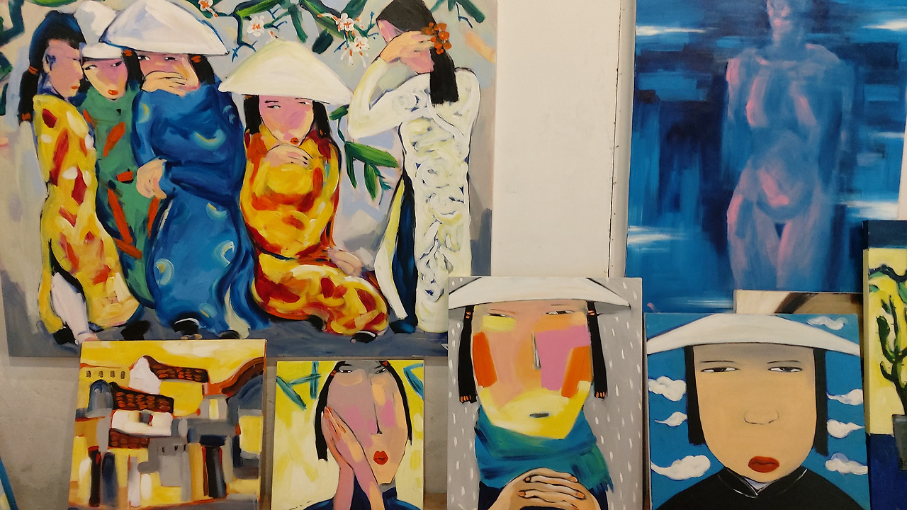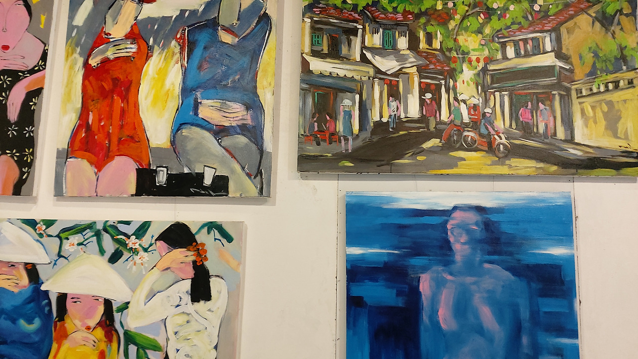 가장 개성적인 스타일을 보여주었던 CO갤러리의 작품들. 베트남에 남은 식민지풍 양식의 저택에 호이안 특유의 노란색을 더한 산뜻한 외관에 독특한 스타일의 베트남여성의 얼굴이 눈길을 끌었다. 화폭을 가득 채운 무표정하고 무덤덤해 보이는 얼굴은 언뜻 불만스러워 보이기도 차가워보이 기도 하는데 묘하게도 그 단순하면서도 다양한 생각을 꼬리 물게 하는 표정이 베트남에서 본 작품들 중에서 가장 인상적으로 남았다.