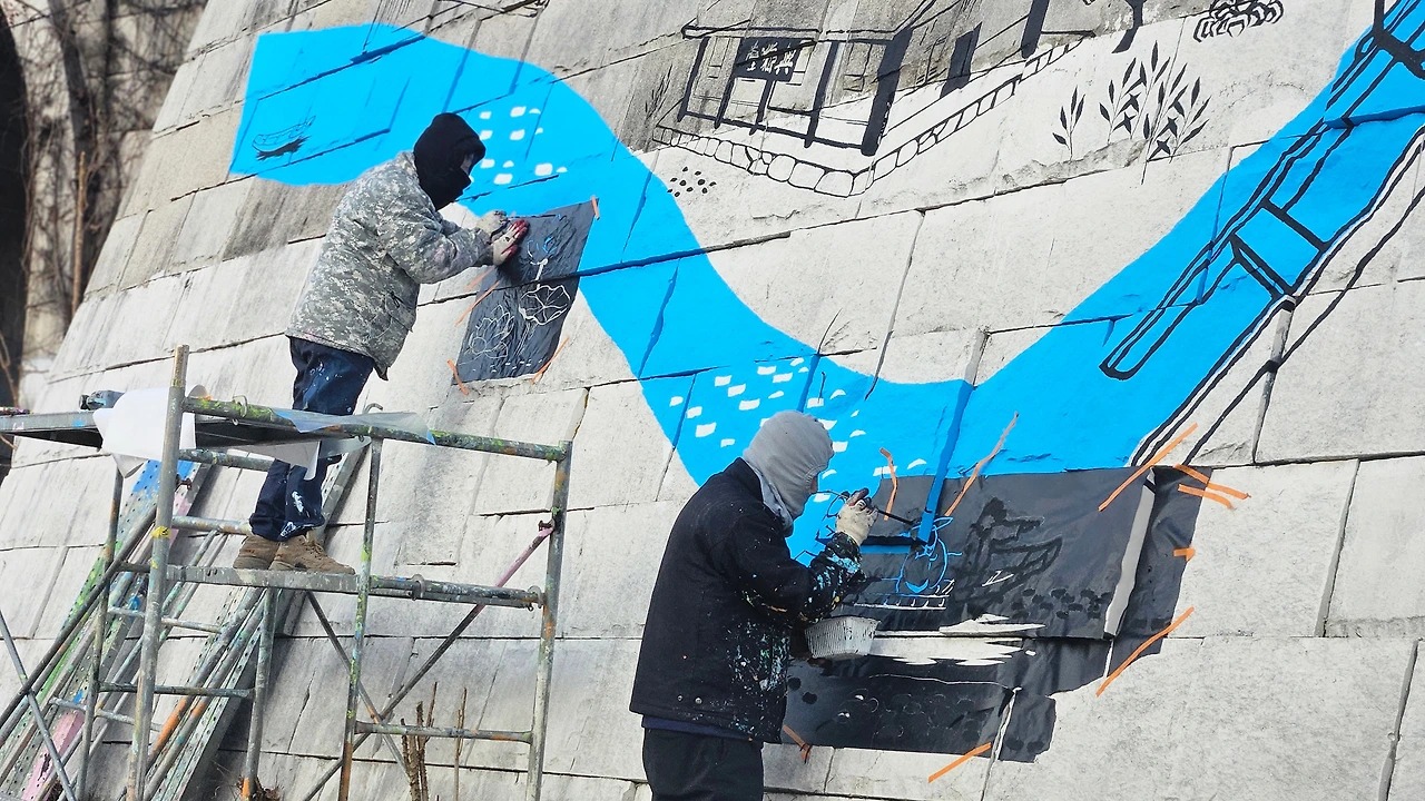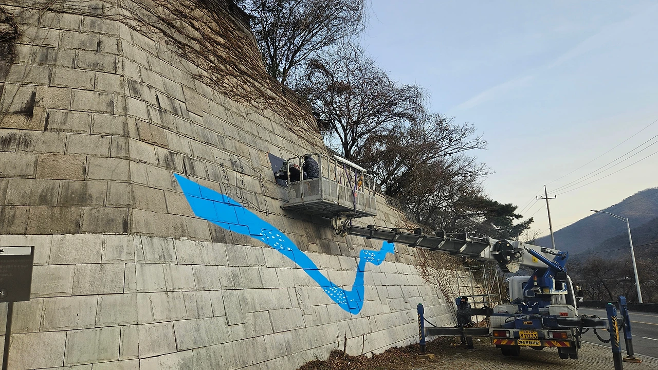 기획이 제안에서 수정을 거듭해서 다듬어지는 과정이 끝나고 나서도 최종본을 구현하는 현장작업이 기다리고 있다. 다산을 기리기 위해서 만든 성곽이기에, 그가 만든 수원 화성의 각 방위에 따라 걸었던 깃발을 참고하여 방위별 깃발을 달고 벽면에는 좌우 벽화작업으로 진행되었다. 11월 대설 이후 완연해진 한겨울이라 벽화 작업은 쉬운 일이 아니었는데, 그래도 현장 작업자 분들이 추위를 견뎌가며 작업을 해주셔서 디자이너의 시안과 오차 없이 나와서 참 기뻤다.