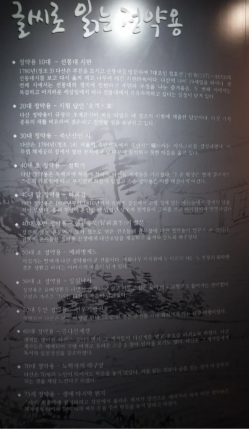 대학에서 조선시대 사상사 수업을 들으며 실학자들에 관심을 갖게 되었고 당연히 정약용도 그중 한 명이었다. 정민교수의 정약용의 공부법을 다룬 책은 여전히 내 책장에 꽂혀 있고 그가 나고 자란 남양주의 정약용유적지에도 그가 귀양살이를 했던 다산초당이 있는 강진에도 몇 차례 가볼 정도로 좋아하는 인물이라 그와 관련한 작업이 반가웠기에 흔쾌히 기획으로 합류했다.