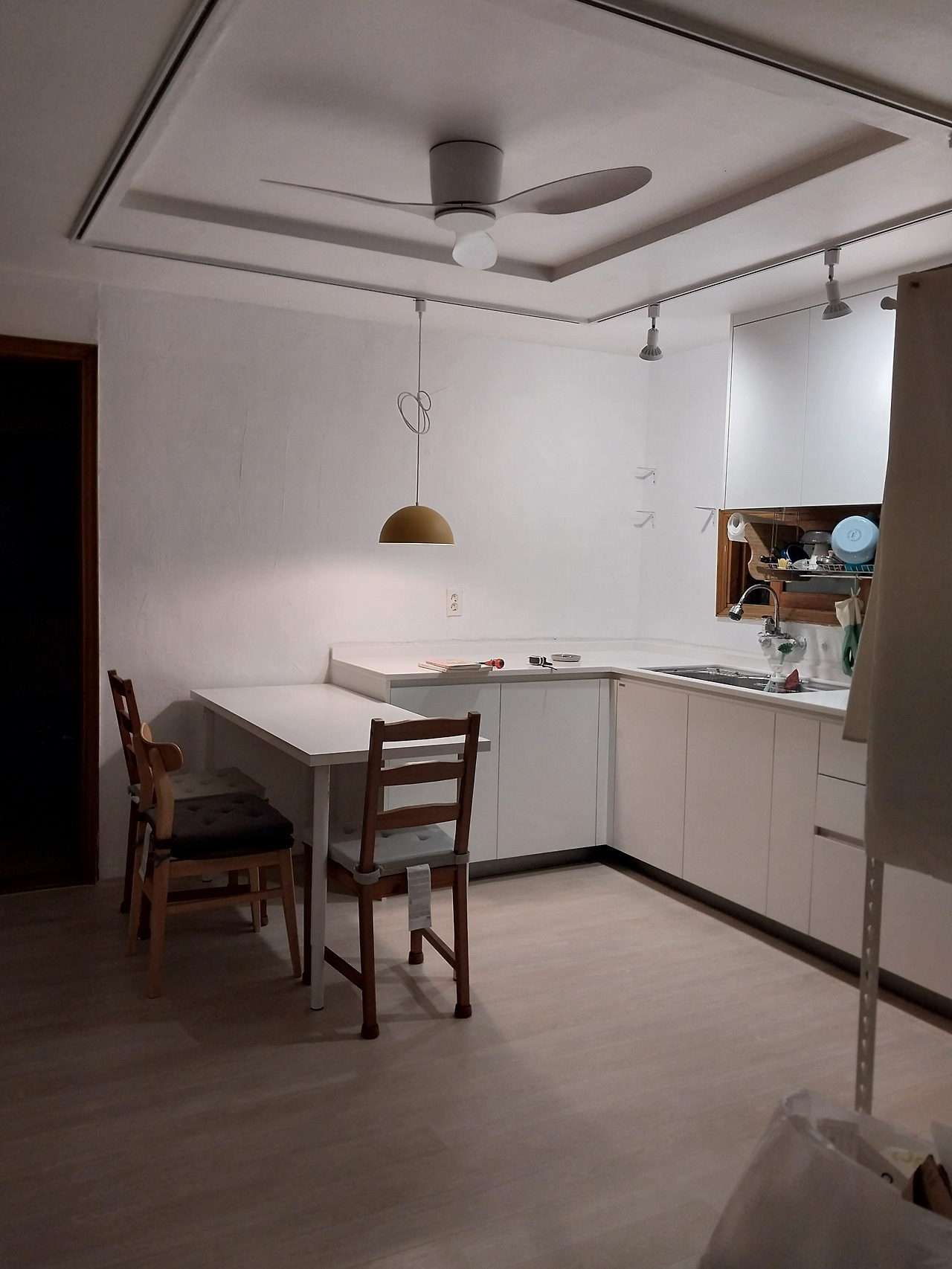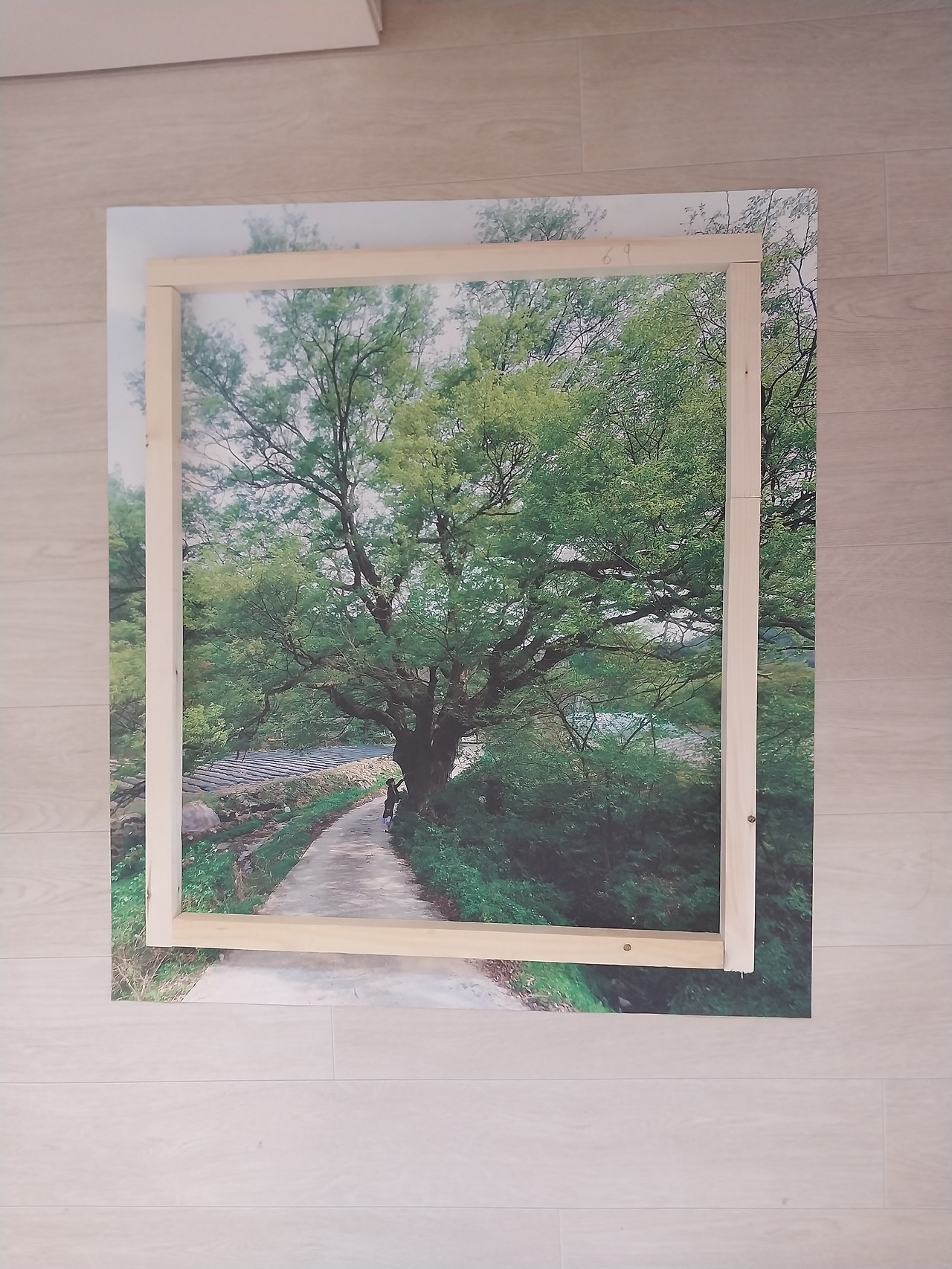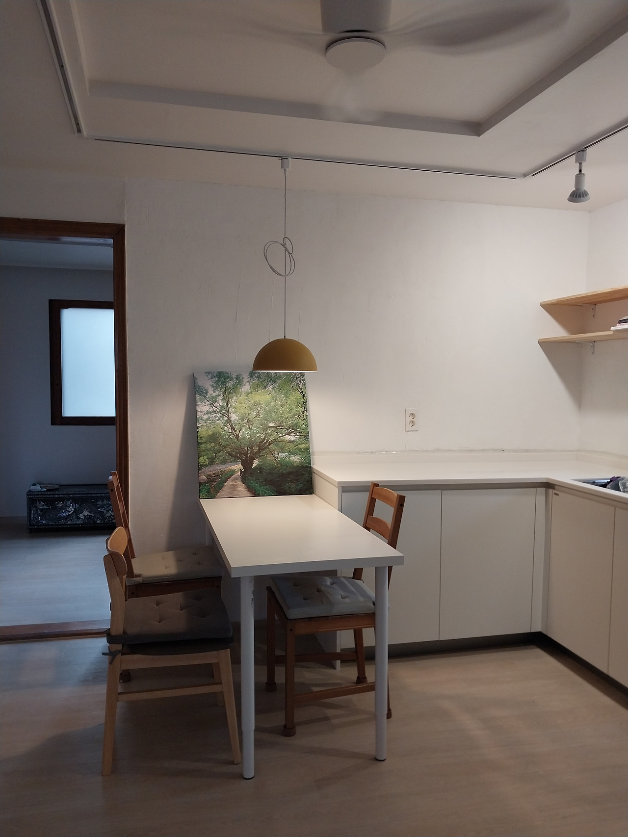 그리고 몇 달 후 액자를 만들었다. 괴산에서 찍은 버드나무 사진을 캔버스천에 인화해 남아있던 인테리어 자재로 프레임을 만들어 씌웠다. 화분을 키울 자신은 없었지만 집 안에 푸르름을 두고 싶었기에, 살아 있는 것을 들이는 대신 살아 있던 순간을 걸어두었다. 그리고 집에 들어와서 거실에 앉아서 혹은 식탁에 앉아서 시선이 제일 먼저 가는 자리 싱크대 위에 두고 마주할 때마다 기쁘게 그 순간을 떠올릴 수 있었다. 그렇게 엄마아빠의 과거, 나의 기억, 현재의 시간이 한 공간에서 흐르며 나는 비로소 이곳에서의 새로운 날들을 만들어가며 감각하기 시작했다. 언젠가는 떠나겠지만 그전까지는 매일매일을 기쁘게 채우고 또 기억할 수 있으리라고.