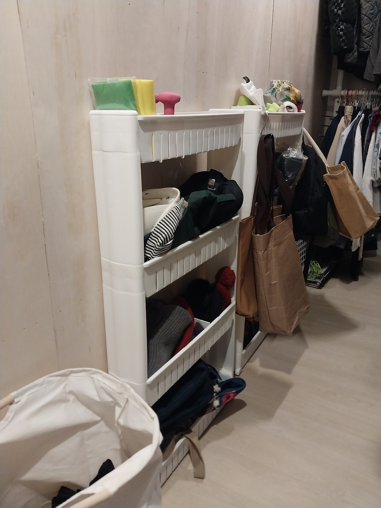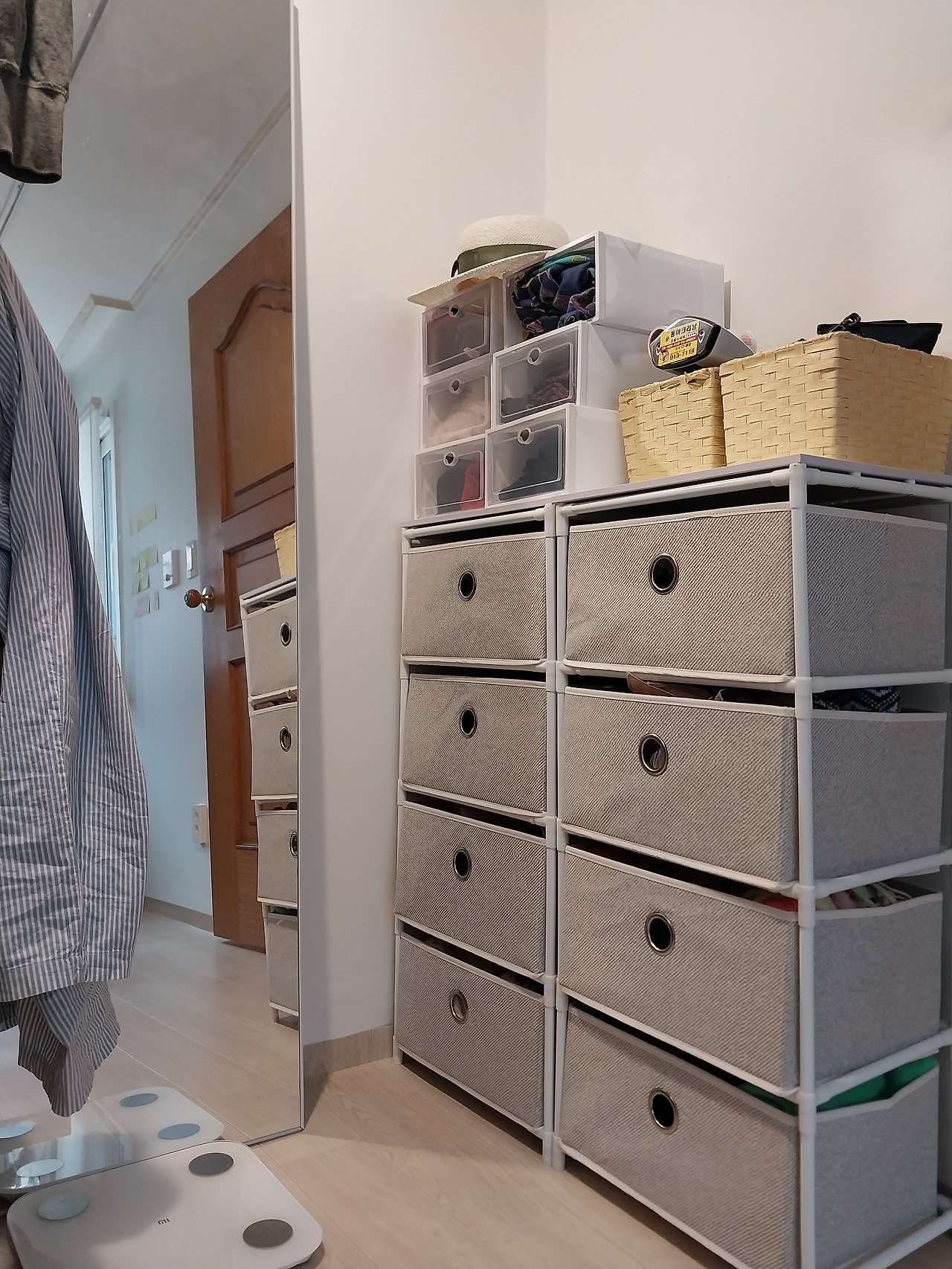 두 번째로 가벽을 세워 만든 워크인클로짓에 둘 얇은 트롤리 둘을 들였다. 이어서 거울 옆에 둘 조립식 서랍장도 들였다. 역시 가볍고 해체해서 이동할 수 있는 것으로 골랐다. 속옷과 양말, 니트를 넣고 나머지 소품들은 이미 있던 바구니와 선반을 재배치해 정리했다. 새로운 것을 더하기보다 가지고 있는 것을 제자리에 두는 것만으로도 충분했다. 행거에서 옷을 고르고 가방과 액세서리를 챙기고 거울을 보며 나갈 채비를 마치는 동선. 작은 배치 하나가 하루를 시작하는 시간을 흐트러지지 않게 잡아주었다.