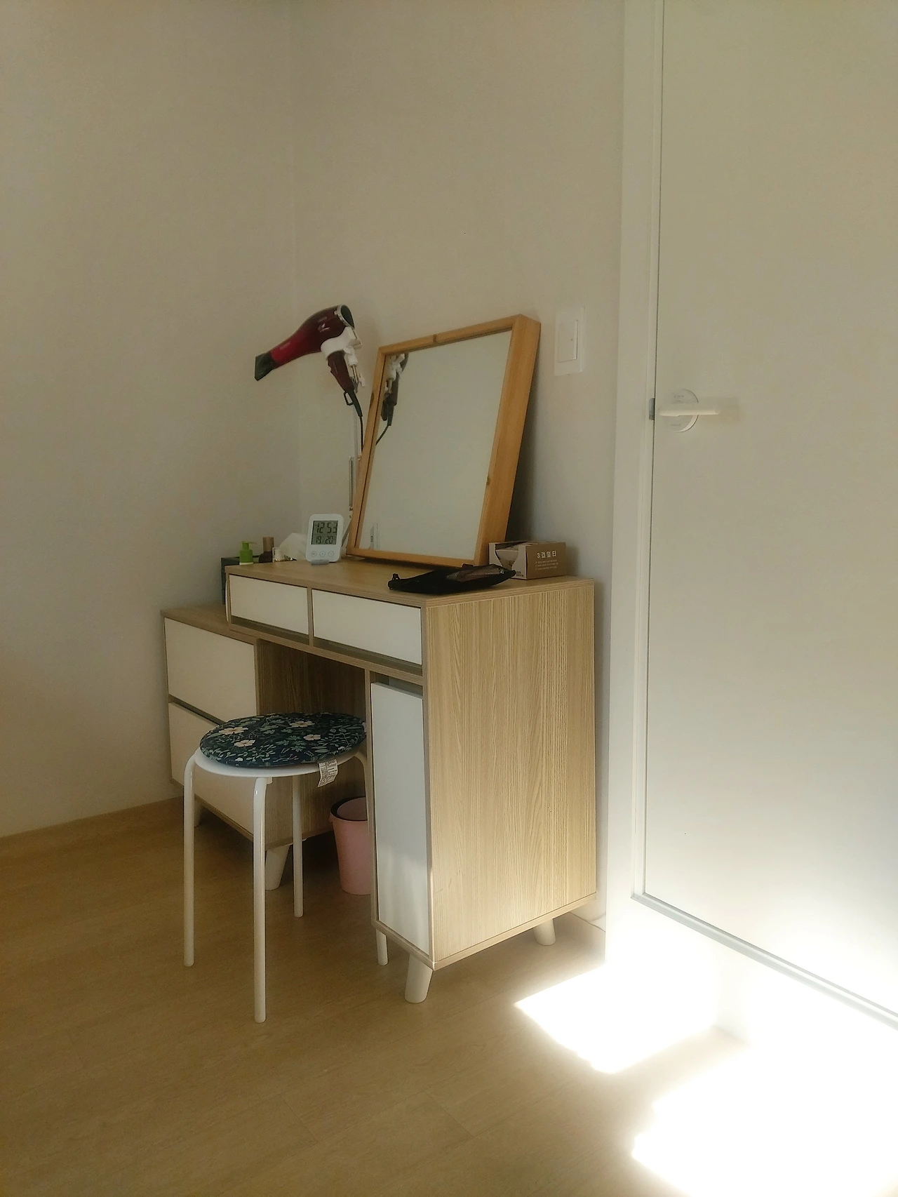 가장 먼저 들인 것은 화장대였다. 화장을 좋아해서라기보다는 나를 돌보기 위한 공간이었기 때문이었다. 엄마는 좌식생활에 익숙했기에 좌식경대를 마주 보며 화장을 하곤 했었다. 무릎이 안 좋아지고 나서는 화장대 앞에 앉는 것도 일어서는 것도 힘들어하던 엄마가 늘 마음에 걸렸다. 나는 스스로를 돌보는 행위에 제대로 된 자리를 주기로 했다. 아침에 씻고 나와 앉아 준비하거나 자기 전에 씻고 나와 잠들 준비를 하는 시간. 그 시간을 위한 자리, 화장대가 첫 번째 가구 선택이 되었다.