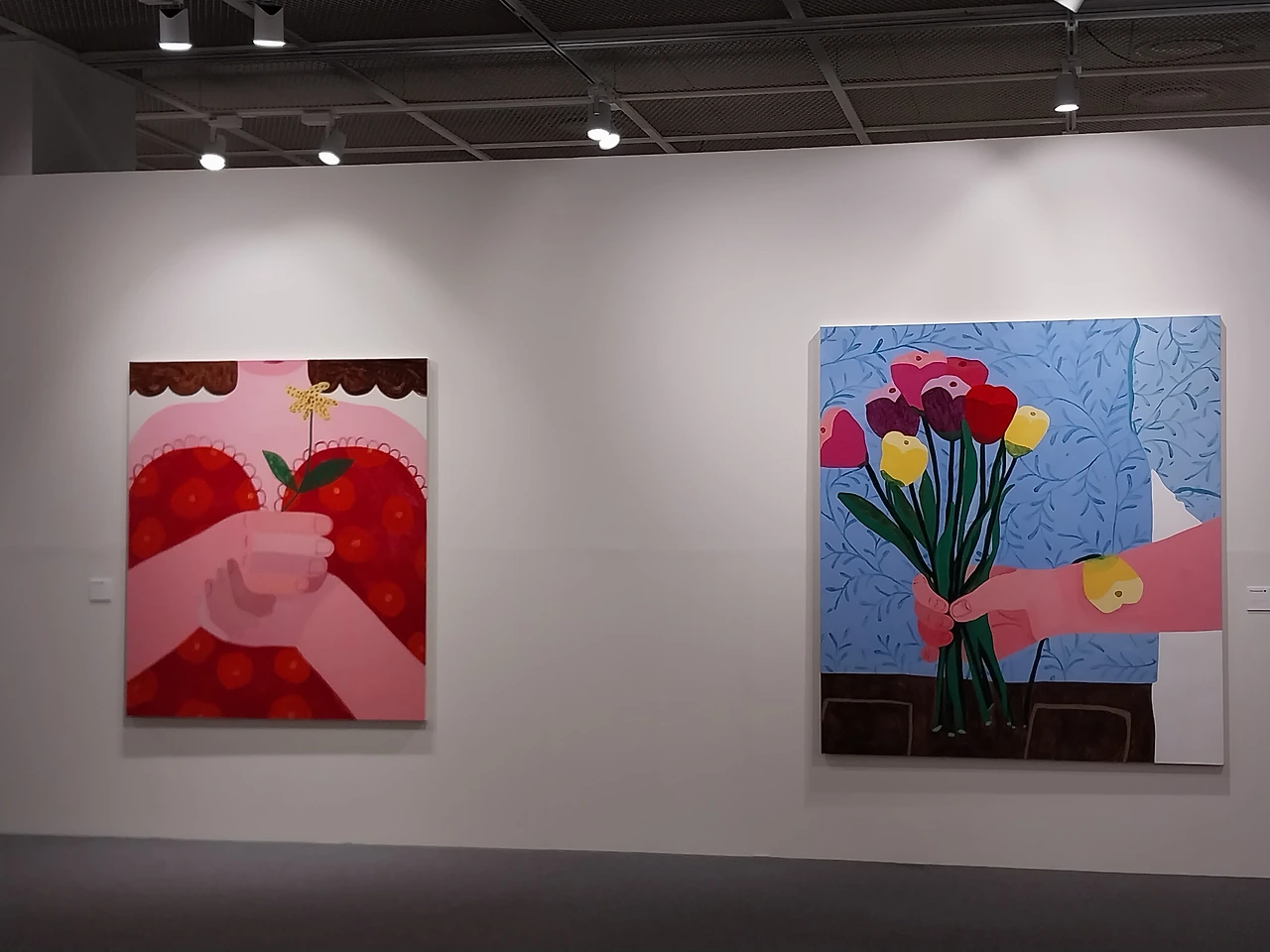 언뜻 보면 선명하고 화려한 색채의 꽃들, 꽃을 건네거나 쥐고 있는 보드라운 곡선의 손과 팔, 그리고 꽃병들은 한없이 가벼워 보이는 단순한 즐거움처럼 보였지만 작가의 문장을 읽고는 어두운 삶을 견디기 위한 위로와도 같은 의미로 다가왔다. 특히나 이 그림을 마주할 누군가에게 꽃을 건네는 것과 같은, 일종의 격려이자 헌사처럼. 다른 어떤 의미나 기법을 논하고 더하기보다, 작가가 전하고자 한 그 의미 그대로 한껏 꽃을 선사하는, 꽃을 건네는 화면의 아름다움을 감상하는 것만으로도 충분한 전시였다. 전시를 못 본 이들에게도 이 리뷰 속 사진들을 감상하며 당신에게 건네는 꽃, 지치고 힘든 하루하루를 위로하고 응원하는 마음을 건네주고 싶었기에. *전시의 제목은 노래의 제목이기도 한데, 관계에 취약해진 이들이 종종 도움을 요청할 때 쓰는 표현이라고도 전하고 있었다.