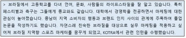 어때요? '브라질 지역향 스포츠 마케팅 전문가'라는 목표를 가지게 된 배경 - 브라질에서의 생활경험, 전공 관련성 - 과 함께 목표를 달성하기 위해 수행해 온 경험 - 졸업논문 작성, KOTRA 인턴 - 을 간략하게 제시해 줬죠? 이로써 목표를 든든히 받쳐주는 성장배경을 완성했습니다.