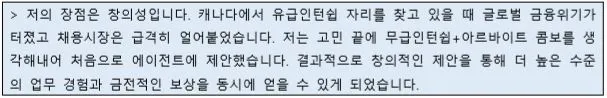 장점으로 창의력을 제시했네요. 그 다음 근거를 제시합니다. 근거에 해당하는 문단은 '문제-솔루션-개선결과'로 구성했습니다.