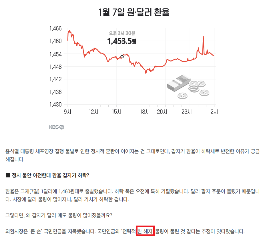 여기까지 살펴보니 오늘 뉴스가 이해가 되었다. 정치 불안이 여전한데 환율이 왜 갑자기 하락했을까? 아마도 국민연금의 전략적 환 헤지 물량이 풀린 것 같다. 그러니까 국민연금에서 환율이 쌀 때 사뒀던 달러를 시장에 풀어서 환율의 상승을 막은 것 같다는 내용인 것이다.