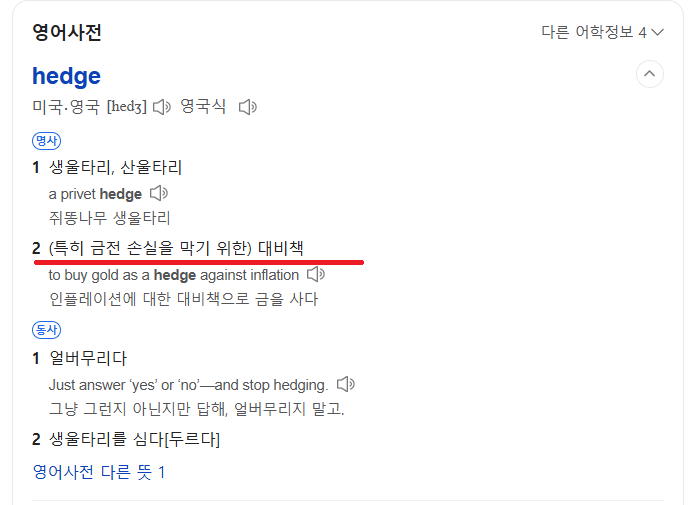 이렇게 물건에 대한 거래가 아니라 기업이나 국가 차원에서 혹시 모를 상황을 대비해 '외화를 미리 확보해 둬야지.'라는 필요성이 생길 수도 있다. 만약에 우리 회사에 급하게 1억 달러의 돈이 필요한데 그때 환율이 1,500원이 된다면? 1,500억 원이 필요할 것이다. 하지만 환율이 1,300원일 때 미리 사두면? 1,300억이면 충분하다. 무려 200억이나 아낄 수 있는 것이다. 그 순간이 되어서 환율이 1,300원보다 낮아져 있다면 다행이지만 환율이 어떻게 변할지는 아무도 알 수 없다. 그러니 그 위험을 예방하기 위해 현재의 가격으로 미리 외화를 사두는 행위도 환 헤지라 할 수 있다.