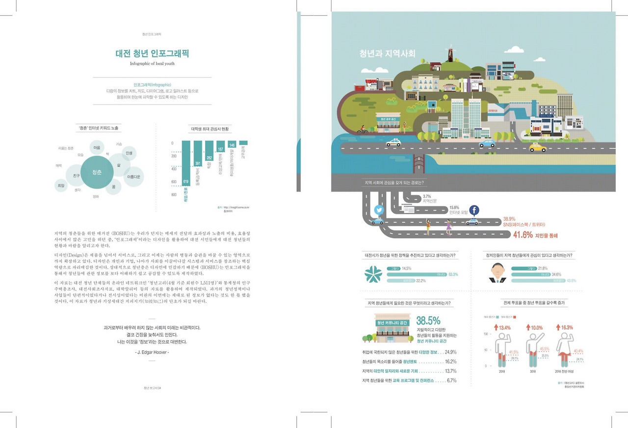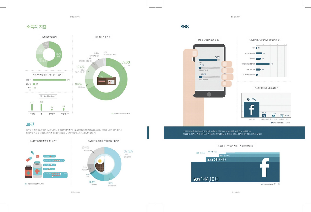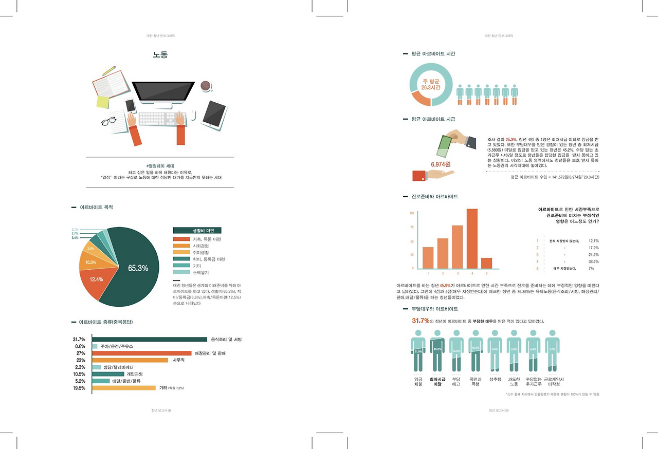 우리는 거의 두달간 인포그래픽에 관한 스터디를 했고, 일년에 한번씩 2회에 걸쳐 이 보고서를 출간했다. 공무원이나 정치인들이 청년들에 대한 관심이 상대적으로 적었기 때문에 확실하고 보기 쉬운 인포그래픽으로 쉽게 만들어내는 게 목표였다.