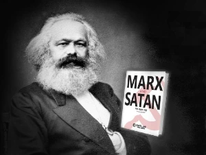 루마니아 공산정권으로부터 탄압받던 리처드 월블란트 목사의 책. 마르크스와 사탄. 맑스의 독특한 헤어스타일 당시 유행하던 사탄교도의 특징이고, 프리메이슨 포즈를 취하고 있다.
