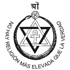 신지학회 심볼. 스와스티카가 상단에 있다. 인도어 '옴'이 최상단에 있고, 영지주의 심볼 우로보노스가 역망성을 감싼다.