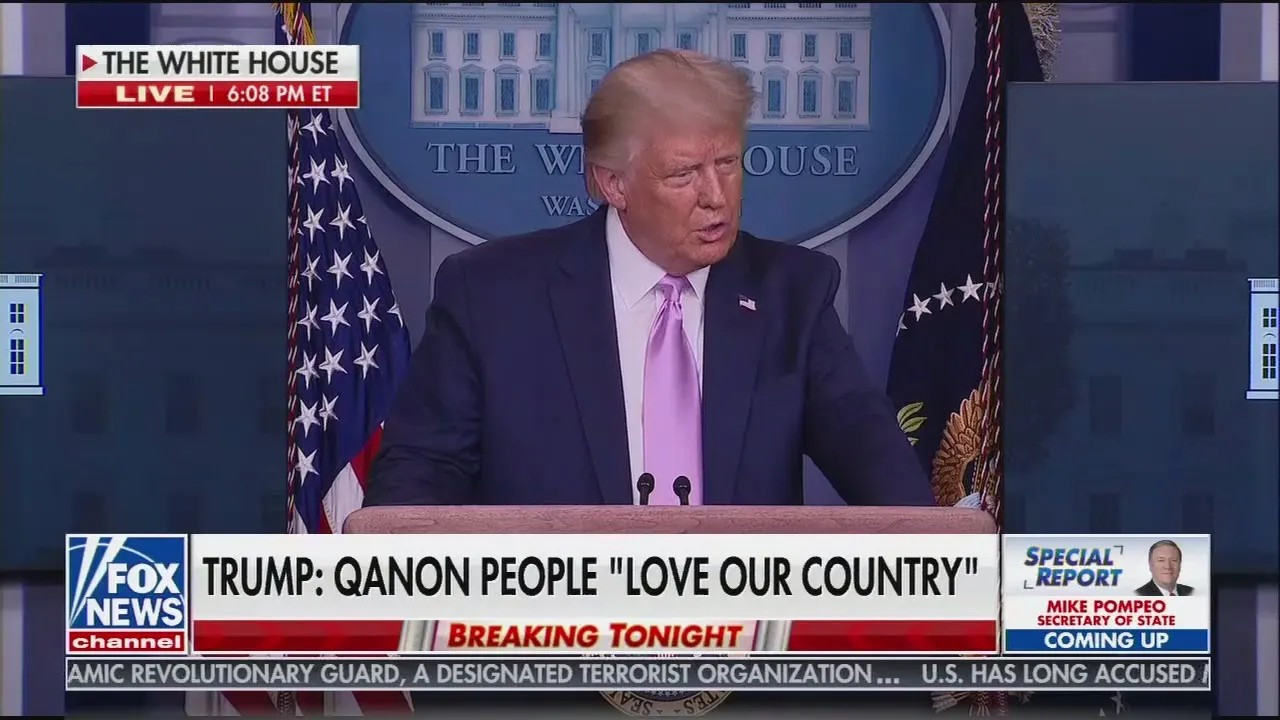 2020년 8월 19일 백악관 기자회견에서 NBC 기자는 도널드 트럼프 대통령에게 QAnon에 대해 직접적인 질문을 던졌다. 기자가 "QAnon은 민주당 인사들이 아동 성범죄 네트워크를 운영한다는 황당한 주장을 믿고 있는데, 대통령은 이들을 지지하십니까?"라고 묻자, 트럼프는 이렇게 답했다.