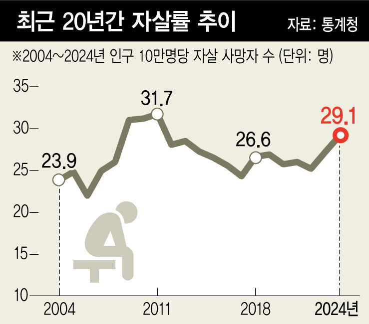- 지난해, 30~50대 자살률이 전년대비 12% 이상 증가했다.