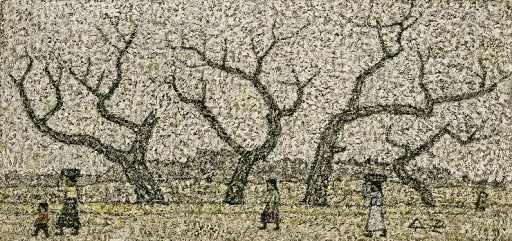박수근의 나무는 나무의 골격, 그 본질을 그리고 있었다. 그래서 그의 나무는 대부분 겨울나무로 보일 수밖에 없었을 것이다. 봄이 오는 길목에서 분홍과 연둣빛이 풀리는 세상을 향해 꽃을 피우는 나무조차 개화의 기쁨을 느끼기가 힘겨웠다. 복사꽃이 어느 날 그냥 피는 것이 아니라는 것을, 저 삭정이처럼 마른 나뭇가지에서 겨우내 응축시켜 둔 수액이, 은총처럼 퍼지는 봄의 기운에 가까스로 물이 돌아 틔워낸 힘으로 꽃을 만들었다는 것을 아프게 보여주고 있었다.