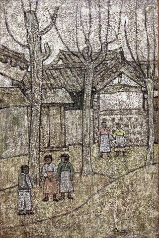 이번 전시에서 그의 그림에 소리가 없다는 것을 발견했다. <골목 안>의 아이들은 활기찬 재잘거림이 없었다. <시장>에는 왁자지껄함이 없었고, <절구질하는 여인>에서도 쿵쿵 소리가 들리지 않았다. 장구와 태평소를 불며 원무를 도는 그림 <농악>에서조차 흥을 누르는 무거운 공기가 느껴졌다.