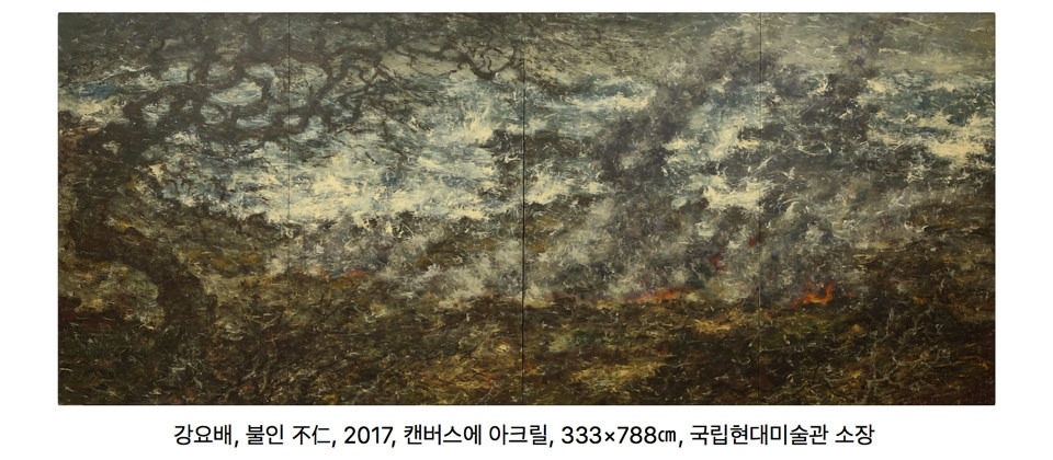 강요배의 팽나무 그림들은 역설적으로 우리에게 희망을 준다. 고통은 더 큰 고통이 위로가 되는 것처럼. 그래서 화가는 말한다, “시련과 같은 바람을 나무가 이기면 우리 삶도 이겨내지 않겠는가”라고.