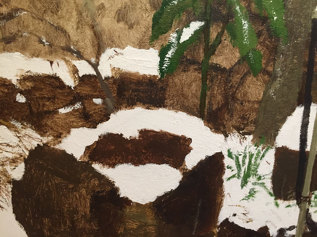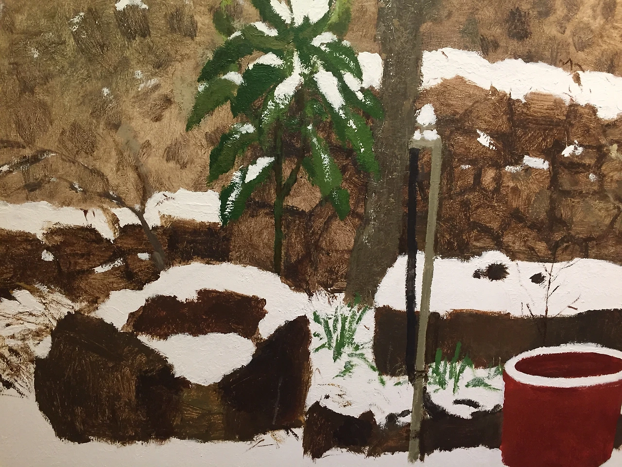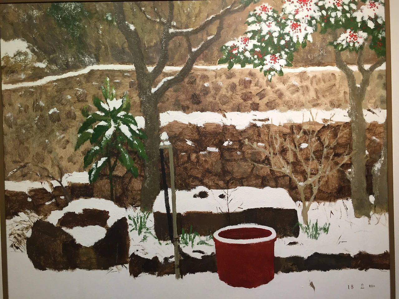 이 작품은 눈이 쏟아져내린 날, 작가 작업실 앞 풍경을 그린 작품이다. 눈 쌓인 수돗가, 겨울에도 영하로 내려가지 않는 제주에서만 보이는 파릇한 채소, 겨울 수선화 , 마른 나뭇가지, 돌확에 담긴 한 움큼 입에 넣어도 될 것 같은 눈.