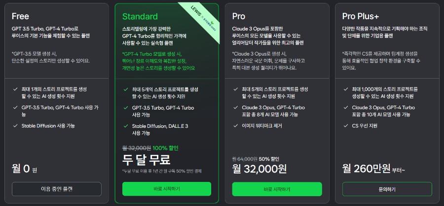 루이스는 이미 구독형 요금제를 시행하고 있었습니다. 무료로는 매달 '최대 1개의 스토리 프로젝트를 생성할 수 있는 AI 생성 횟수 지원', Standard는 '최대 5개의 스토리 프로젝트를 생성할 수 있는 AI 생성 횟수 지원'한다고 하는데요, 구독을 시작하고 확인해 보니 Free는 20회, Standard는 120회였습니다.