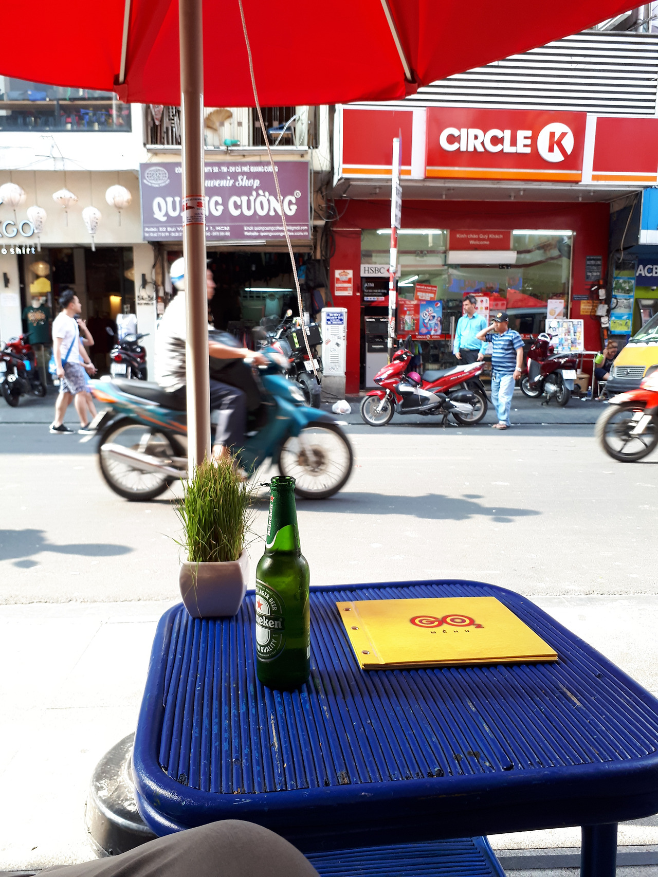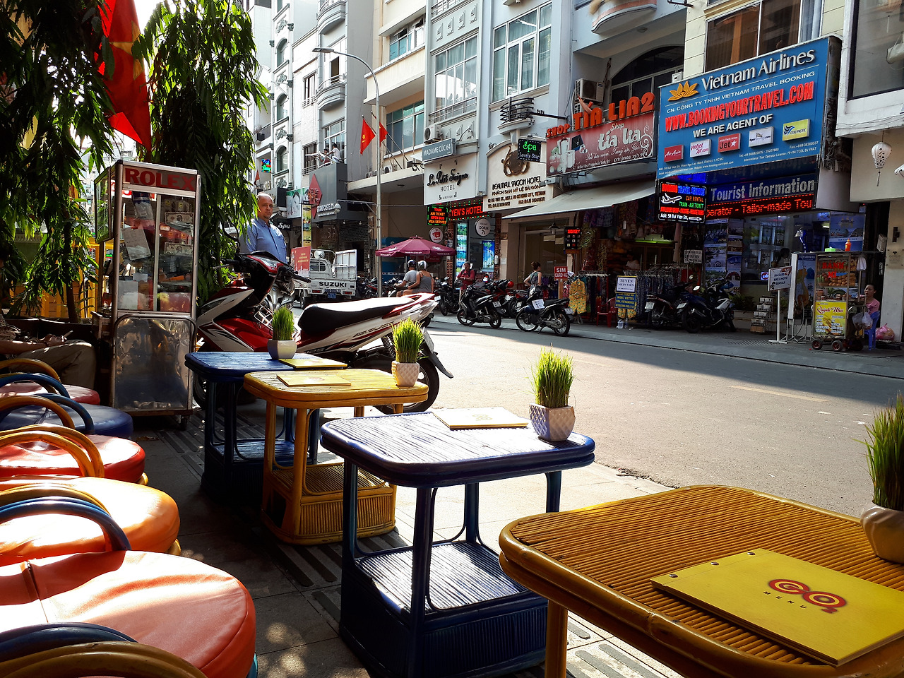 베트남 호치민의 상점 테라스는 서로 마주 보게끔 해놓지 않고 거리를 바라보게끔 해놨다. 그러다 보니, 혼자 오더라도 자신 앞에 빈 의자를 마주할 일은 없다.