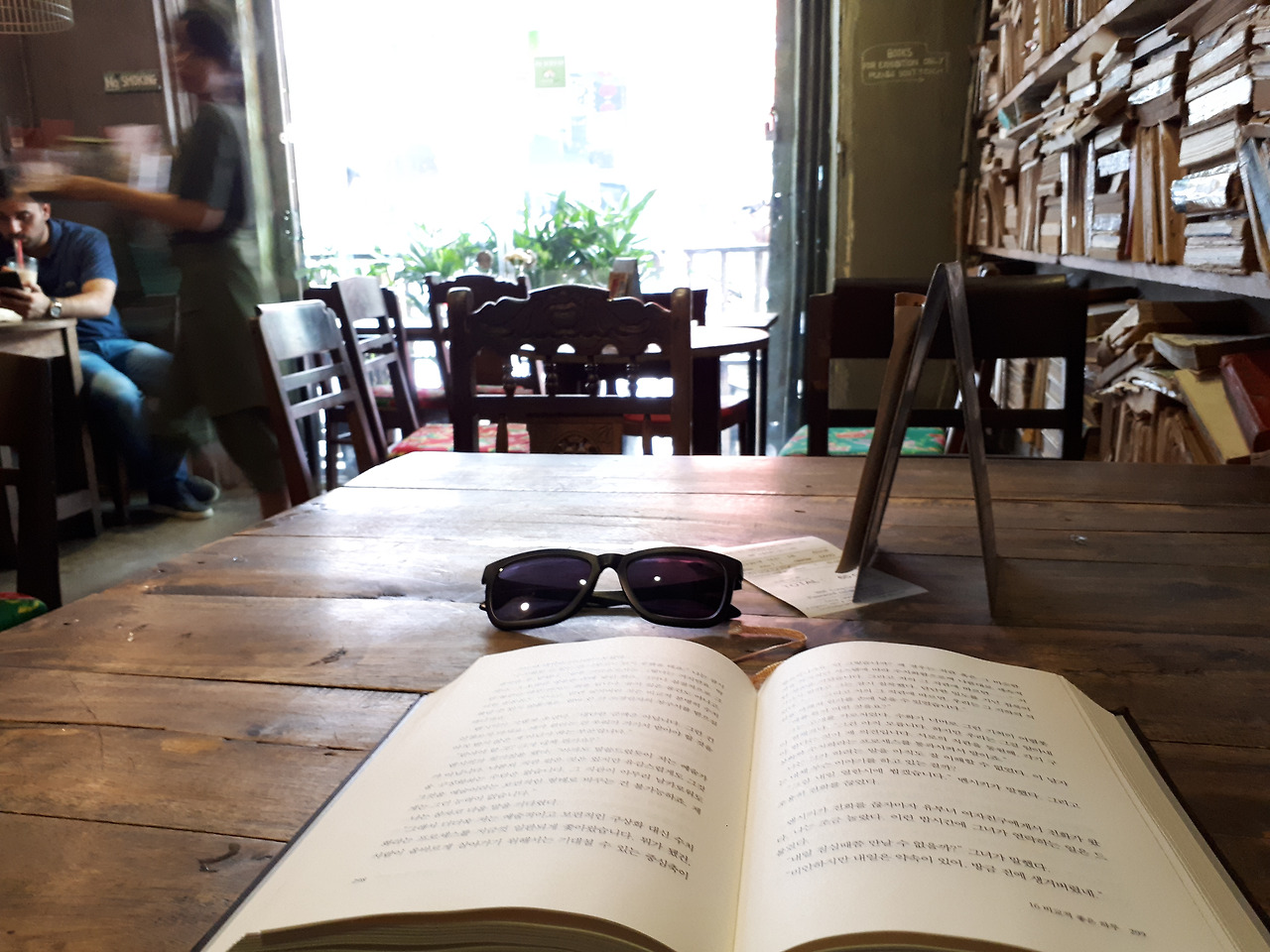 지금은 활짝 펴기조차 힘들어 보이는 누런 책들이 카페 벽면 빼곡히 쌓여있었다. 살짝 기울어진 오래된 테이블과 적절한 조합이었다.