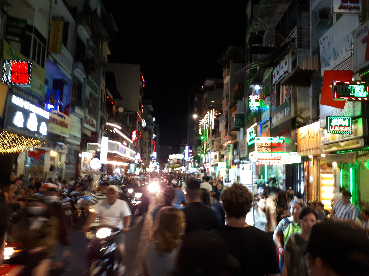 내 숙소가 있는 여행자 거리엔 향락의 지옥이자 천국의 문이 이미 열려있었다. 양쪽 가게에서 뿜어대는 스피커의 소리는 내 심장을 불규칙하게 뛰게 했다. 번쩍번쩍하는 네온사인 간판과 레이저가 거리를 향해 쏘우고 있었다.
