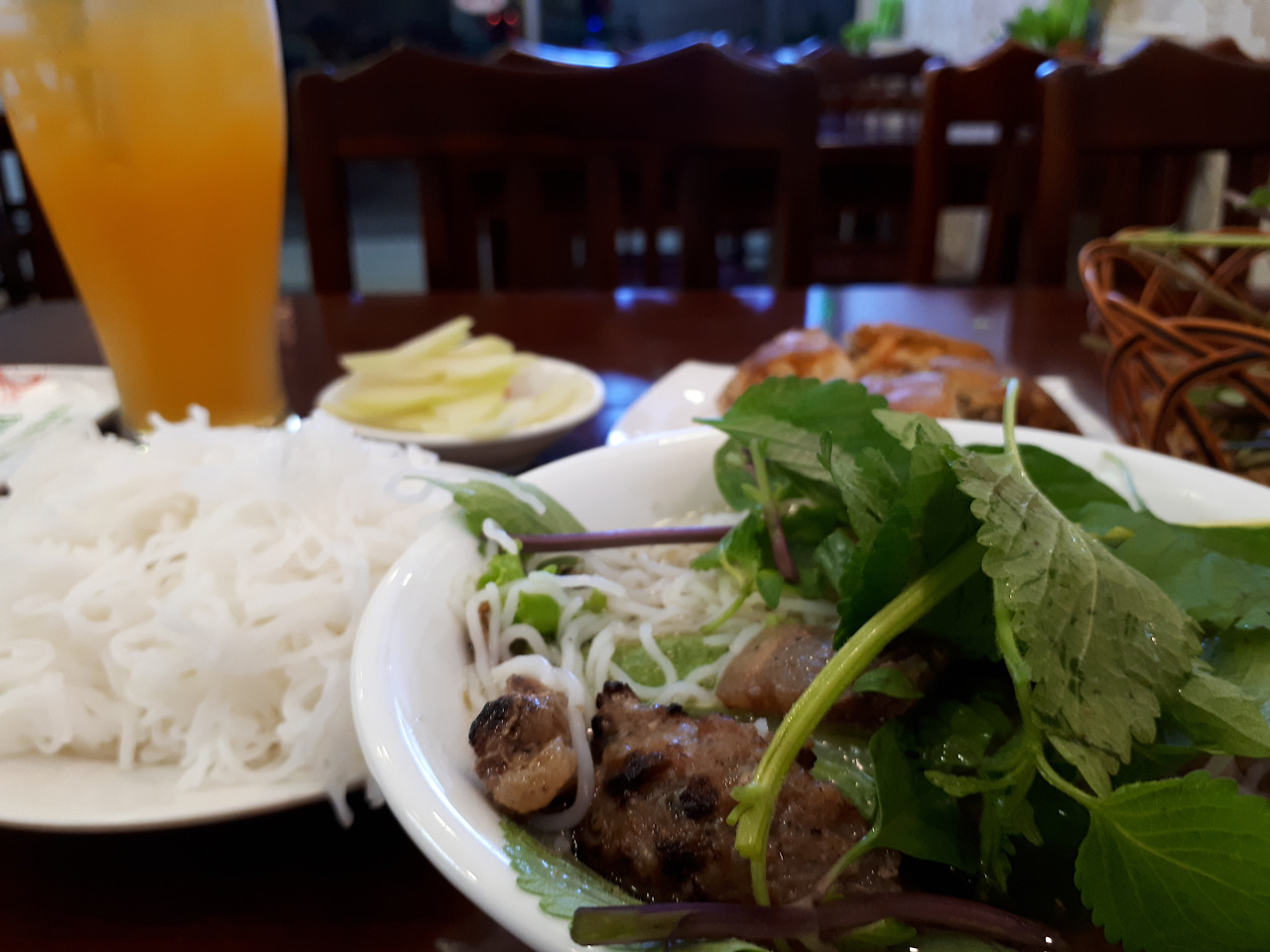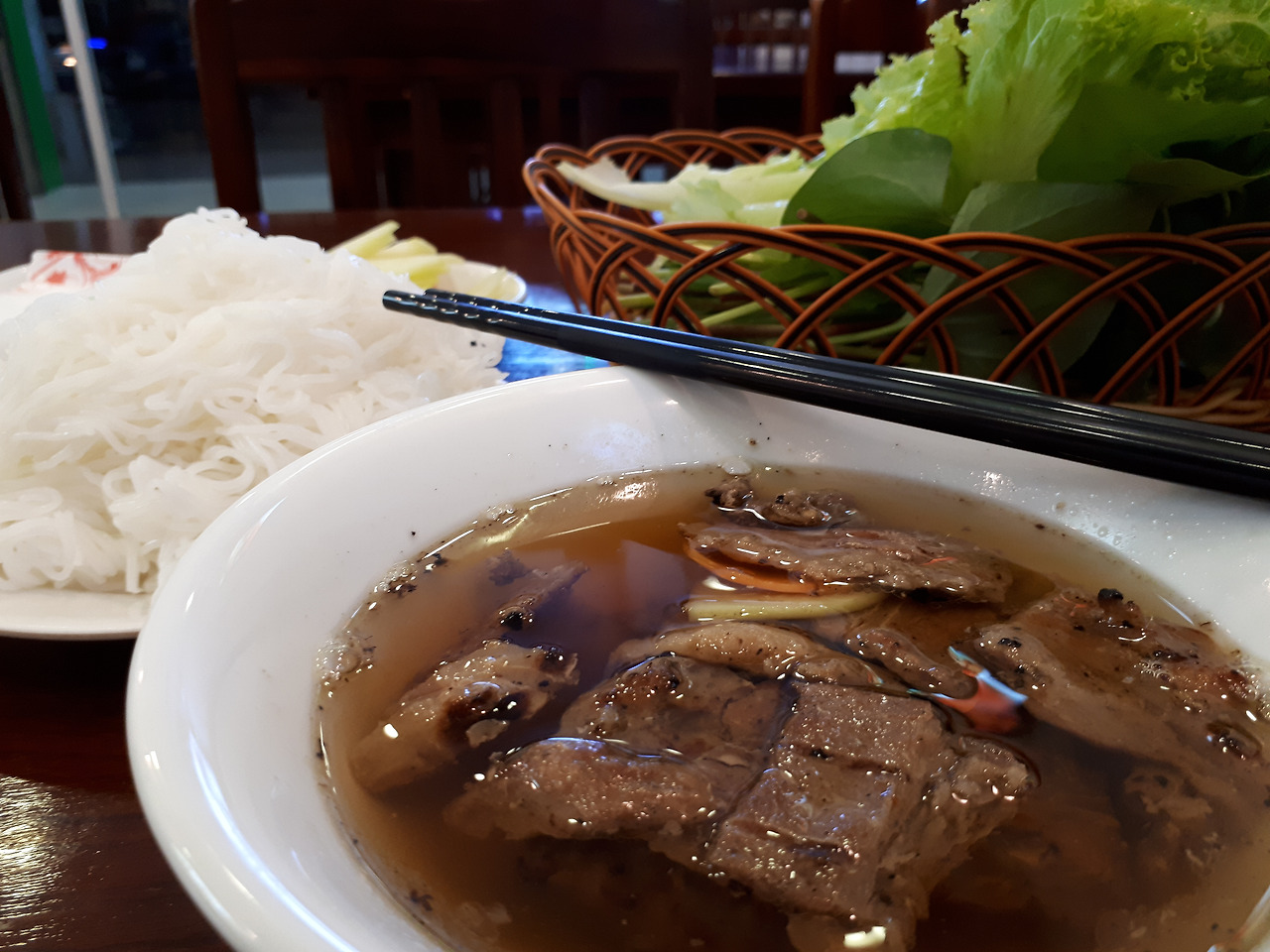 한 젓가락에 고기를 두 점씩 먹어도 남을만한 고기의 양. 그리고 보통의 쌀국수와 달리 우동면을 쓰고 있어 오동통한 면발의 느낌이 좋았다.