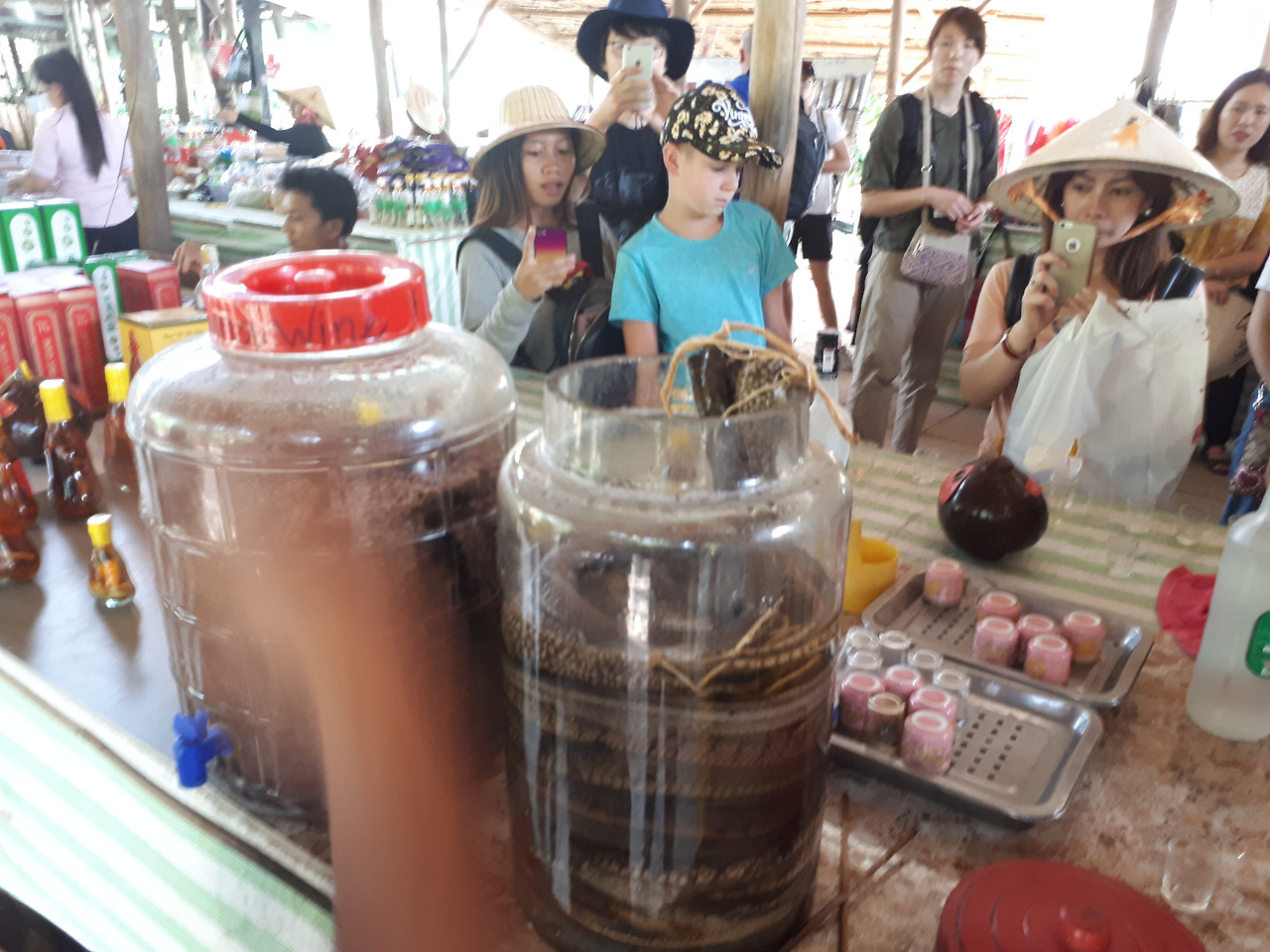 그 사이, 가이드는 뱀통에서 술을 한 국자 퍼냈다. 건너편에 있던 서양 어린이들은 "끄악-"하며 고주파 탄성을 질러댔다. 나도 그렇게 소리 지르고 싶었다. 조금만 더 어렸어도.