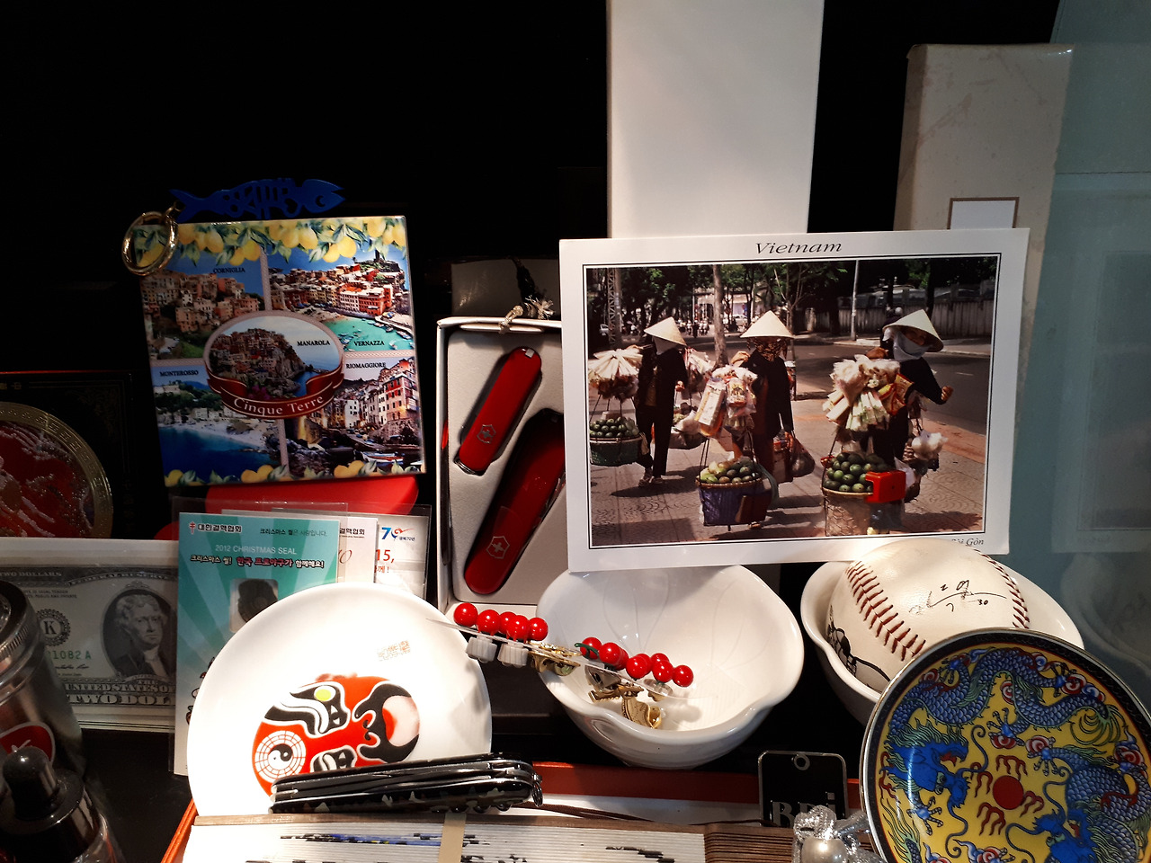 결국, 일본 기타큐슈를 갔아왔을 때 사온 북어 인형, 오사카의 소주잔, 타이페이의 유물 미니어처, 캄보디아의 앙코르와트 미니어처 그리고 베트남의 엽서 한 장이 진열장 안을 꾸미게 됐다.