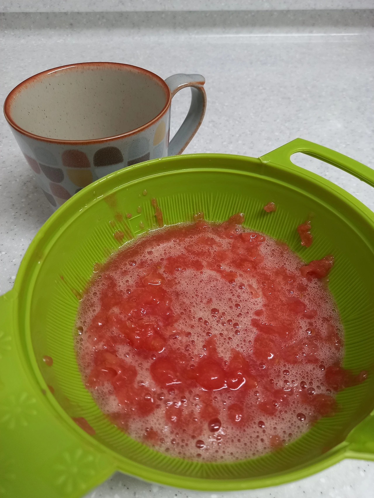 나와 동생은 옆에 앉아서 어머니가 토마토를 가는 모습을 재미있게 봤다.