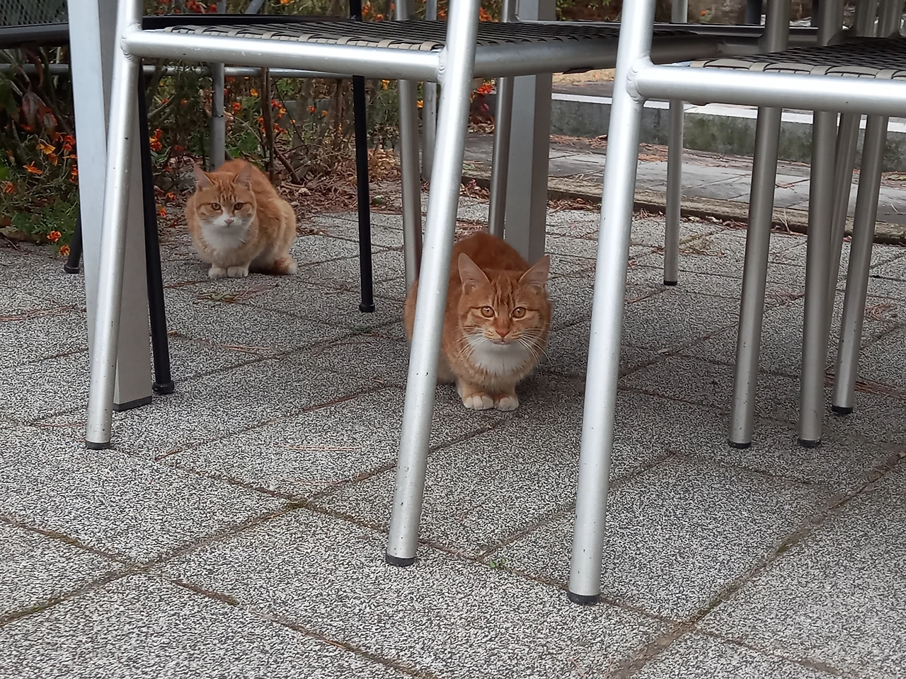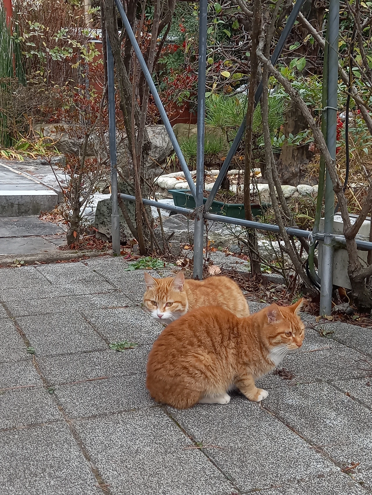 음료를 주문하고 앉아 있는데, 정원에 고양이 두 마리가 보였다.