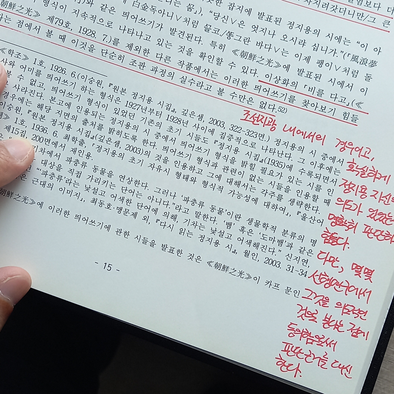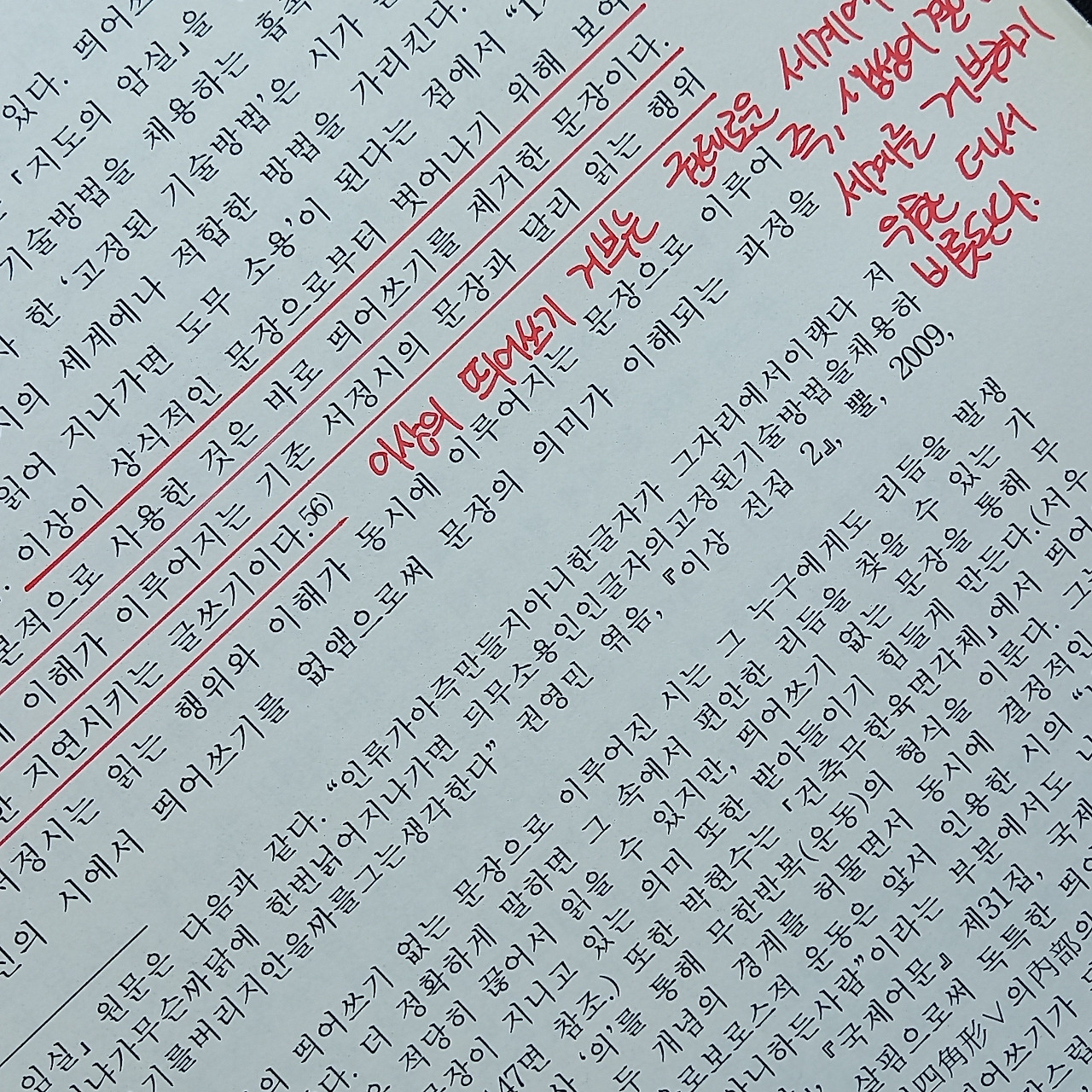 논문을 쓰고 나서 첫 소논문을 쓰기 위해 다시 읽어 나갔던 기억이 있다. 그 시간이 붉은 메모로 고스란히 남아있다. 이제는 정말 볼 일이 없는 졸고. 여전히 졸고만 쓰고 있는 나지만, 이때의 나는 더없이 부끄럽다.
