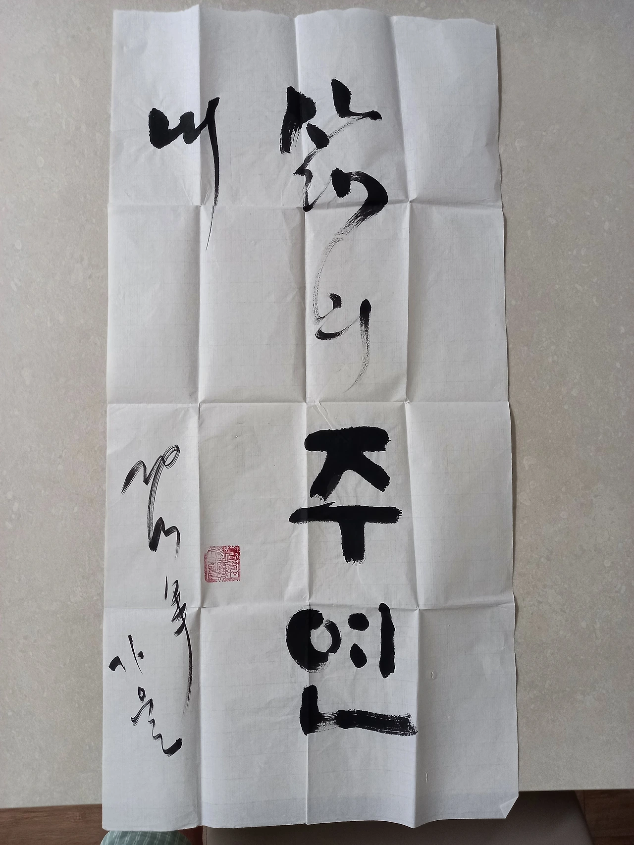 사진 속 글귀는 2013년 10월의 물건이다. 국어문화원 연구원으로 참여한 한글날 축제에서 한글 붓글씨를 써주는 분께 부탁한 글귀다. 아내의 이름인 주연과 그대는 내 삶의 주인공이라는 중의적 의미를 담아 저렇게 써 달라고 부탁했다. 아내가 그것을 상자 안에 두었었는데, 얼마 전에 아들과 함께 상자 안의 물건을 꺼내 보다가 저걸 나에게 보여주며 깔깔 웃었다. 나도 참 깔깔 웃었다.