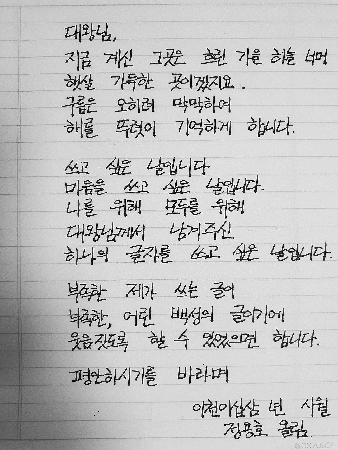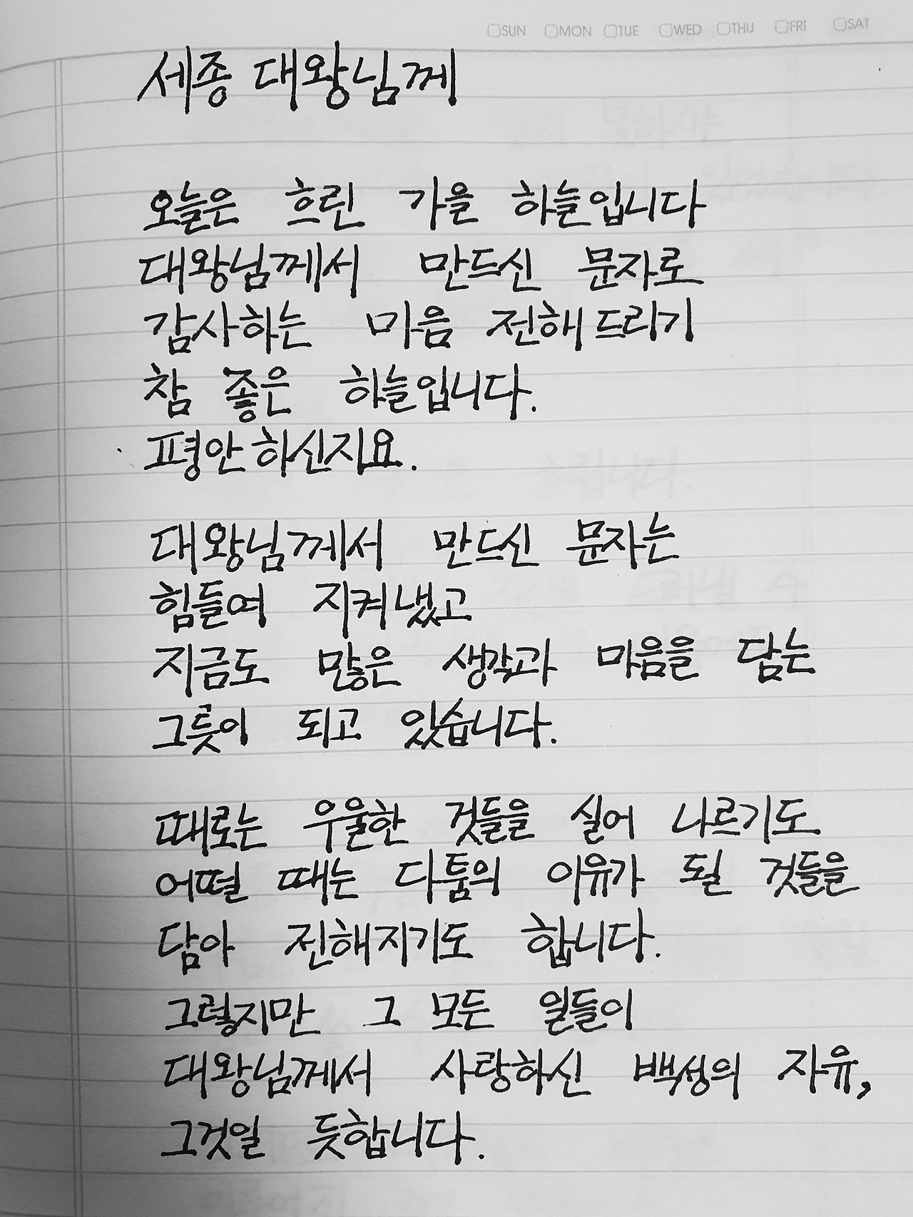 우리 글자를 만들어주신 세종대왕을 향한 감사함을 표현해 보면 어떨까요.