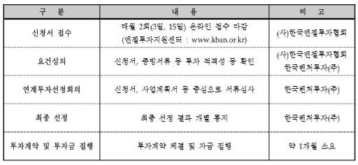 - 연계투자선정회의에서 심의하여 선정된 기업에 대해 보통주 신주 투자