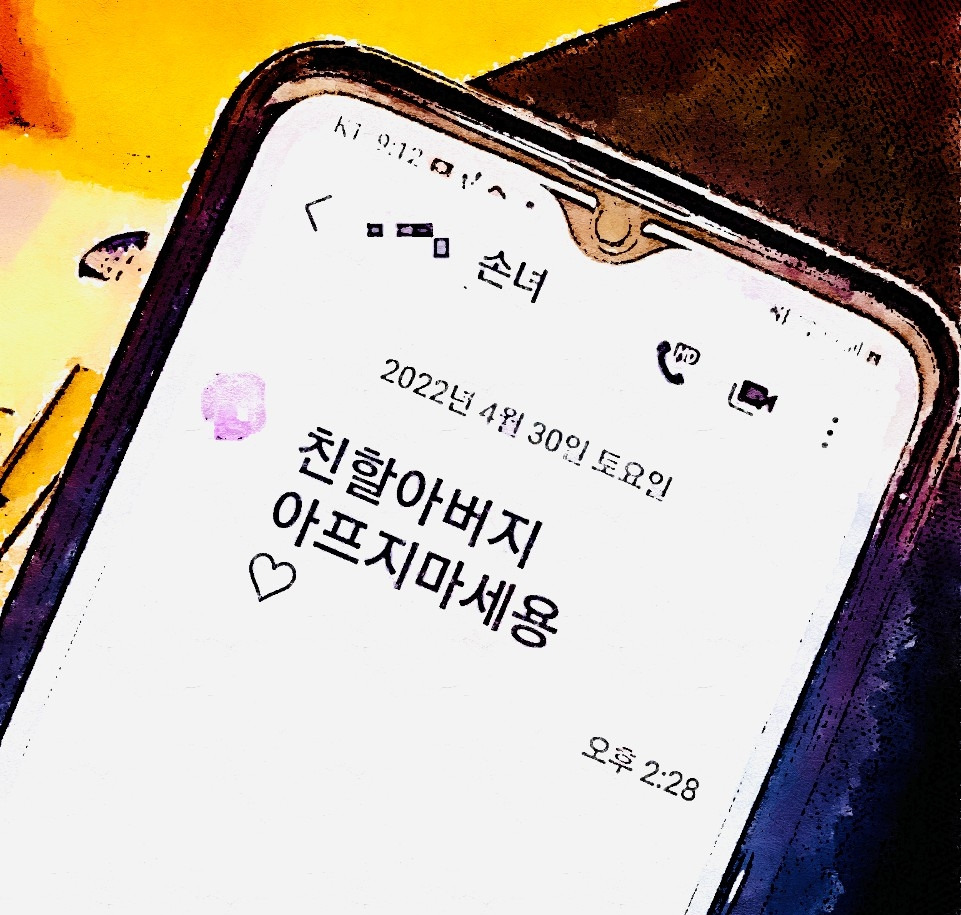 아이들 엄마가 둘째 딸의 옆구리를 찔러가며 보낸 문자이겠지만, 친 손녀가 보낸 '아프지 말라'는 문자도 확인을 못하셨다. 눈물이 다시 흘러내렸다. 아버지의 핸드폰을 접어 빈소 옆에 있는 탁자에 조용히 올려두었다.