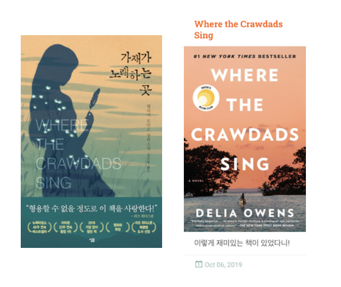 2. 가제가 노래하는 곳 - 그냥 엄청 재미있는 소설책이다. 아마존에서 약 1년 동안 1위 했었다. 러브스토리와 스릴러가 잘 접목 되었다. 영어로 읽었는데 너무 재미있어서 한글책도 샀다.