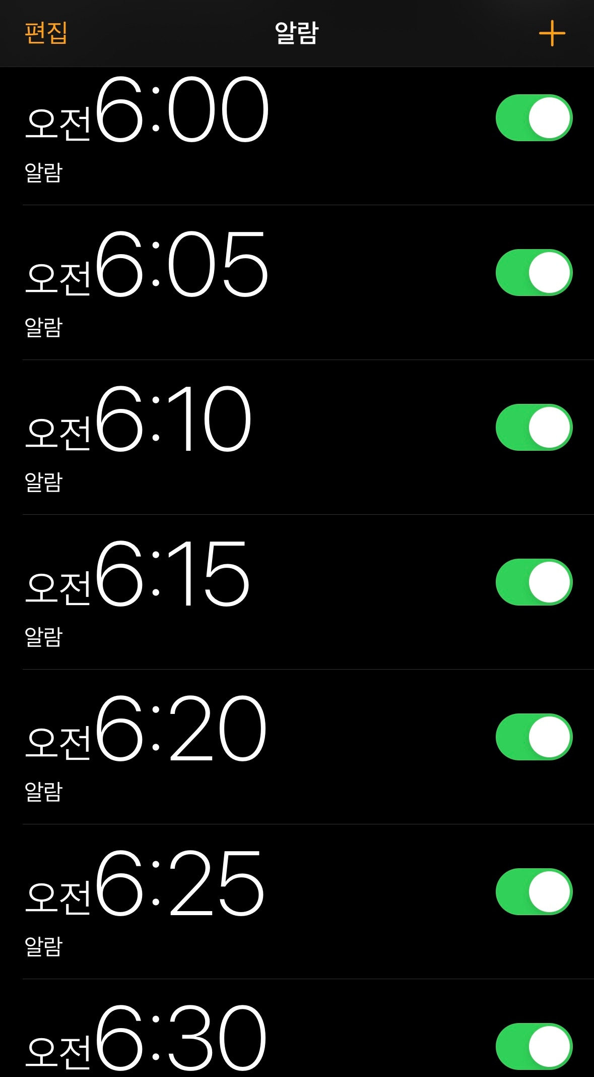 알람을 여러 수십 개를 맞춰 놓고 들리면서도 절대 단번에 일어나지 않으며, ‘5분만, 5분만…!‘ 하다가 30분~40분이 지나서야 침대 밖으로 발을 뻗는다.