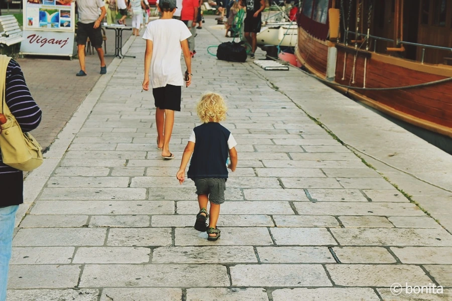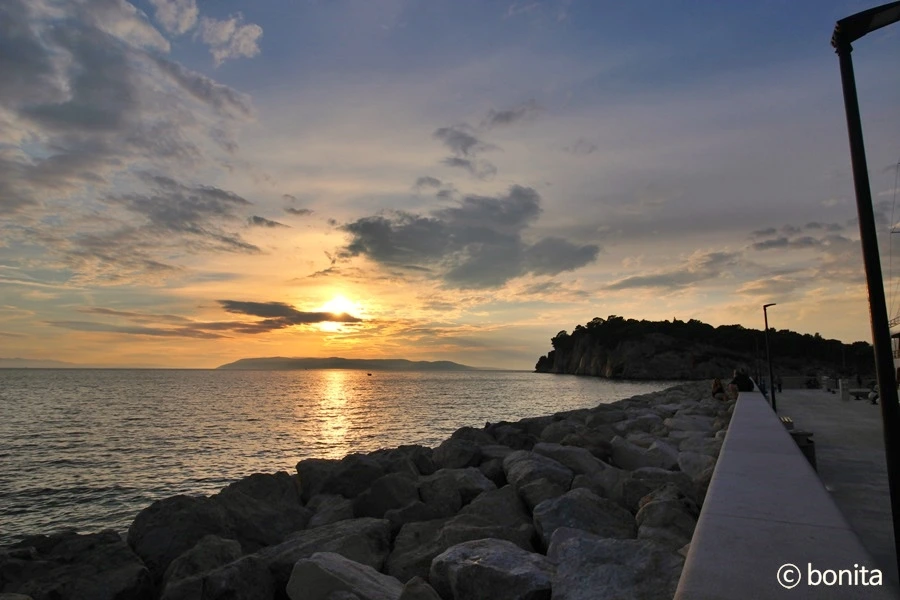 잠깐 발걸음을 멈추고 해가 지는 아드리아해를 보기 위해 담벼락에 올라앉는다.