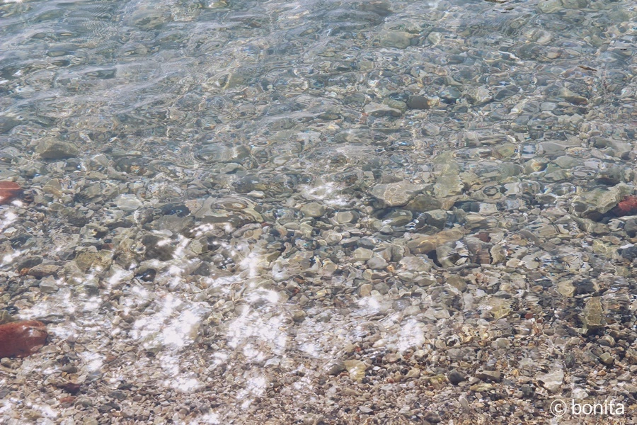 한껏 들뜬 마음을 안고 조그맣고 커다란 자갈들을 밟으며 물속에 발을 담근다.