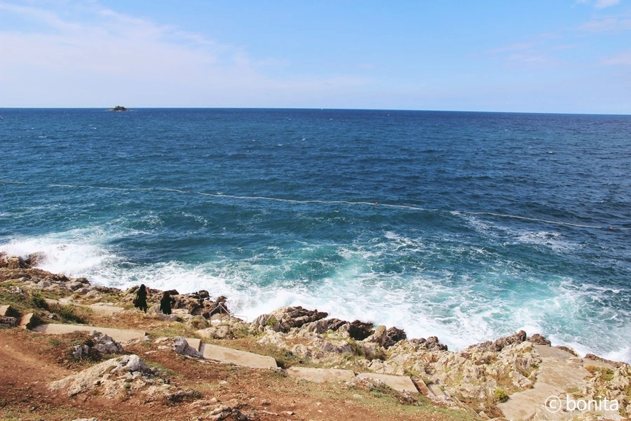 바위에 걸터앉아 파도가 세차게 일렁이는 바다를 바라보기도 한다.