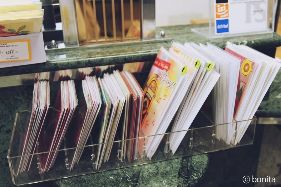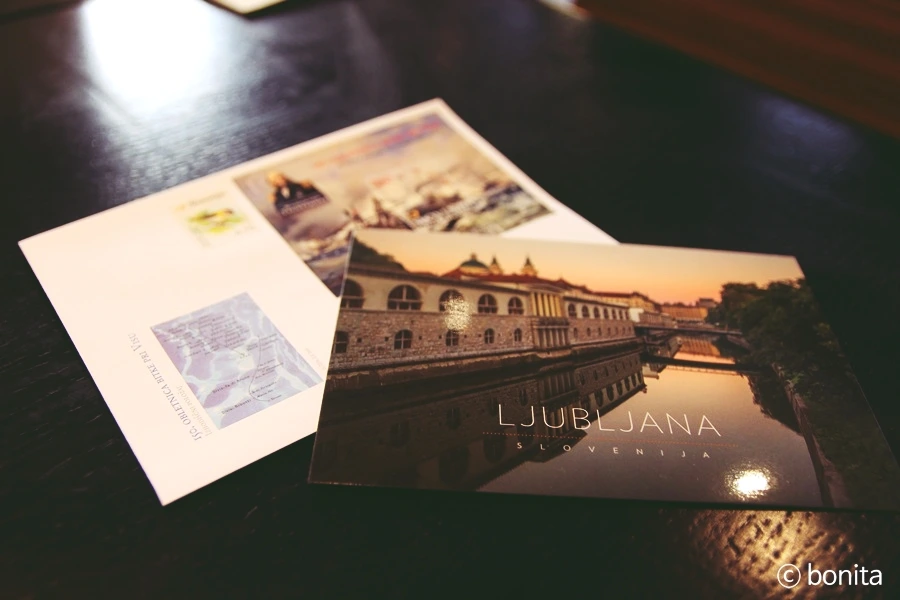 류블랴나의 아름다운 강과 선셋이 담긴 엽서를 한 장 집어 든다.