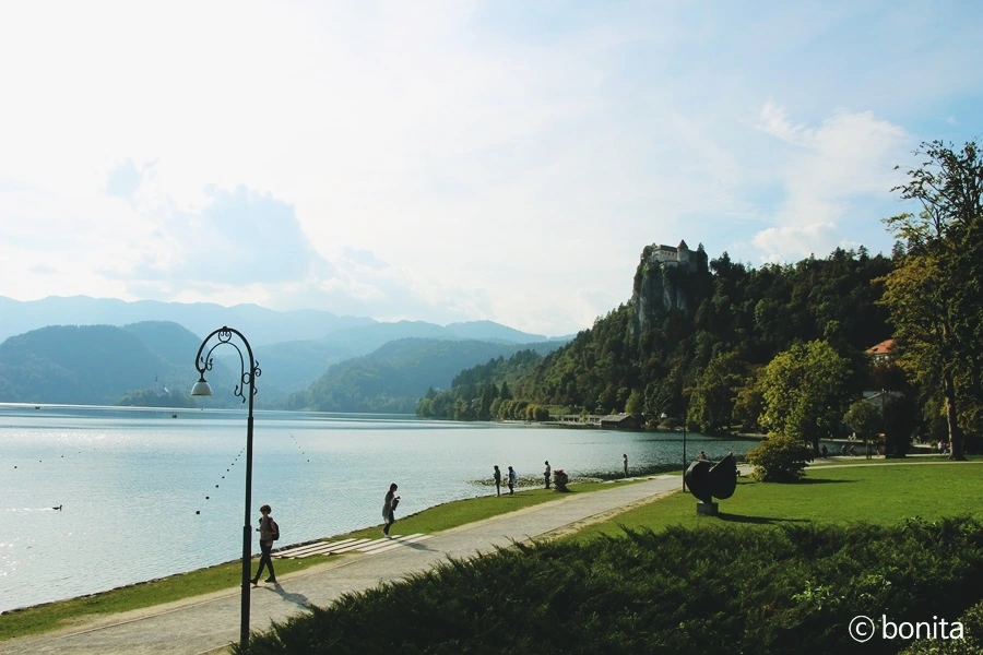널따란 호수를 따라 저 멀리 블레드성이 보인다.
