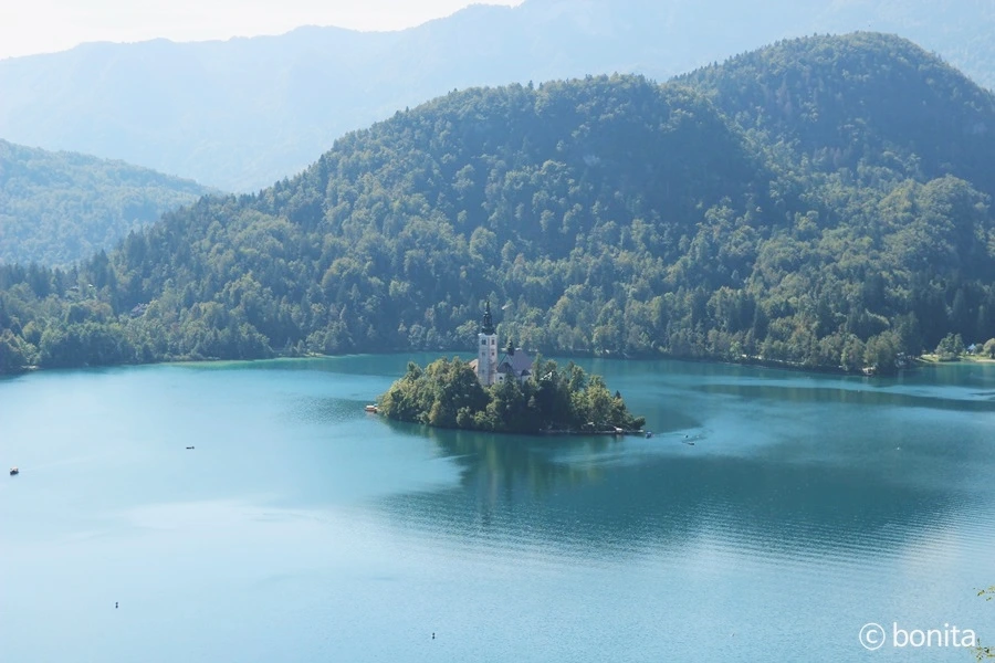 초록빛 숲으로 둘러싸인 블레드 섬.