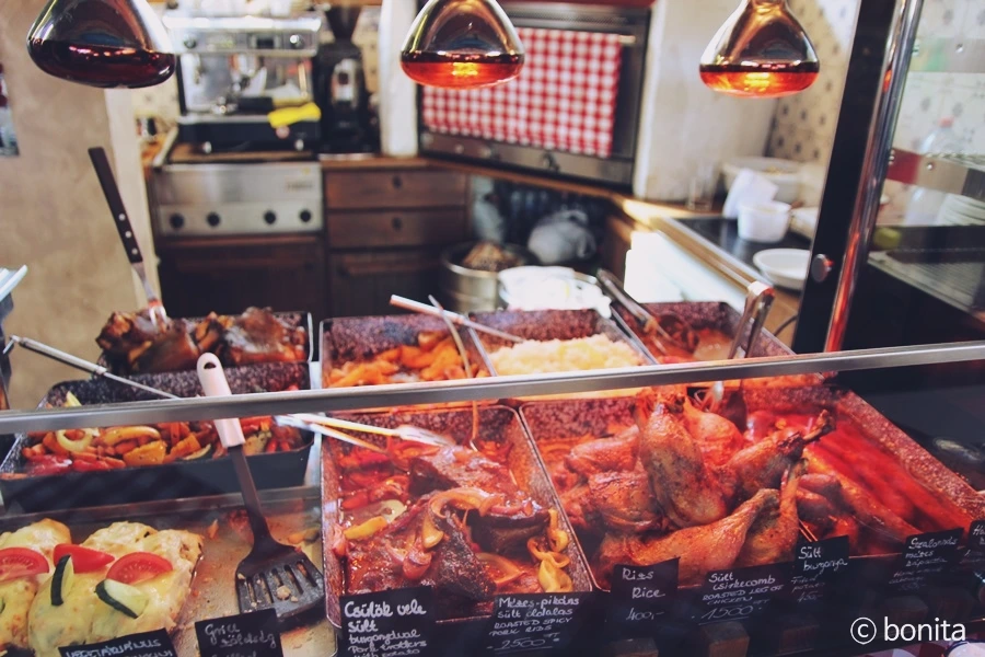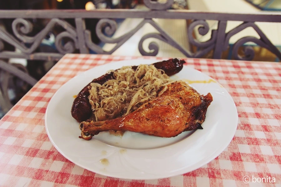 자리가 날 만한 곳에 짐을 풀어놓고 간단히 소시지와 양배추 절임, 그리고 닭다리 하나를 주문했다.